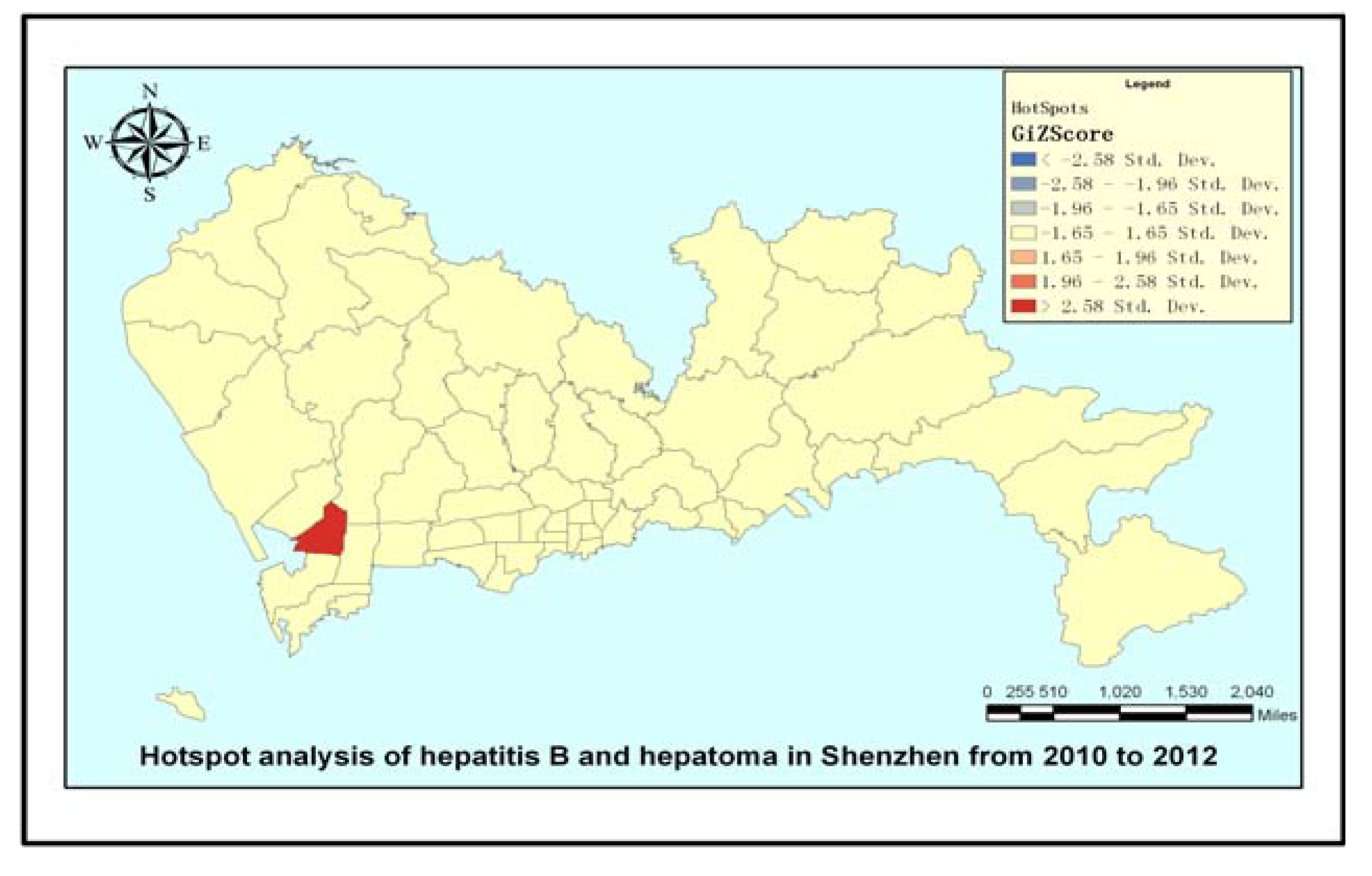 The map in Figure 3 displays a hotspot analysis for hepatoma in Shenzhen from 2010 to 2012 at the sub-district level. We use hot spot analysis (Getis-ord