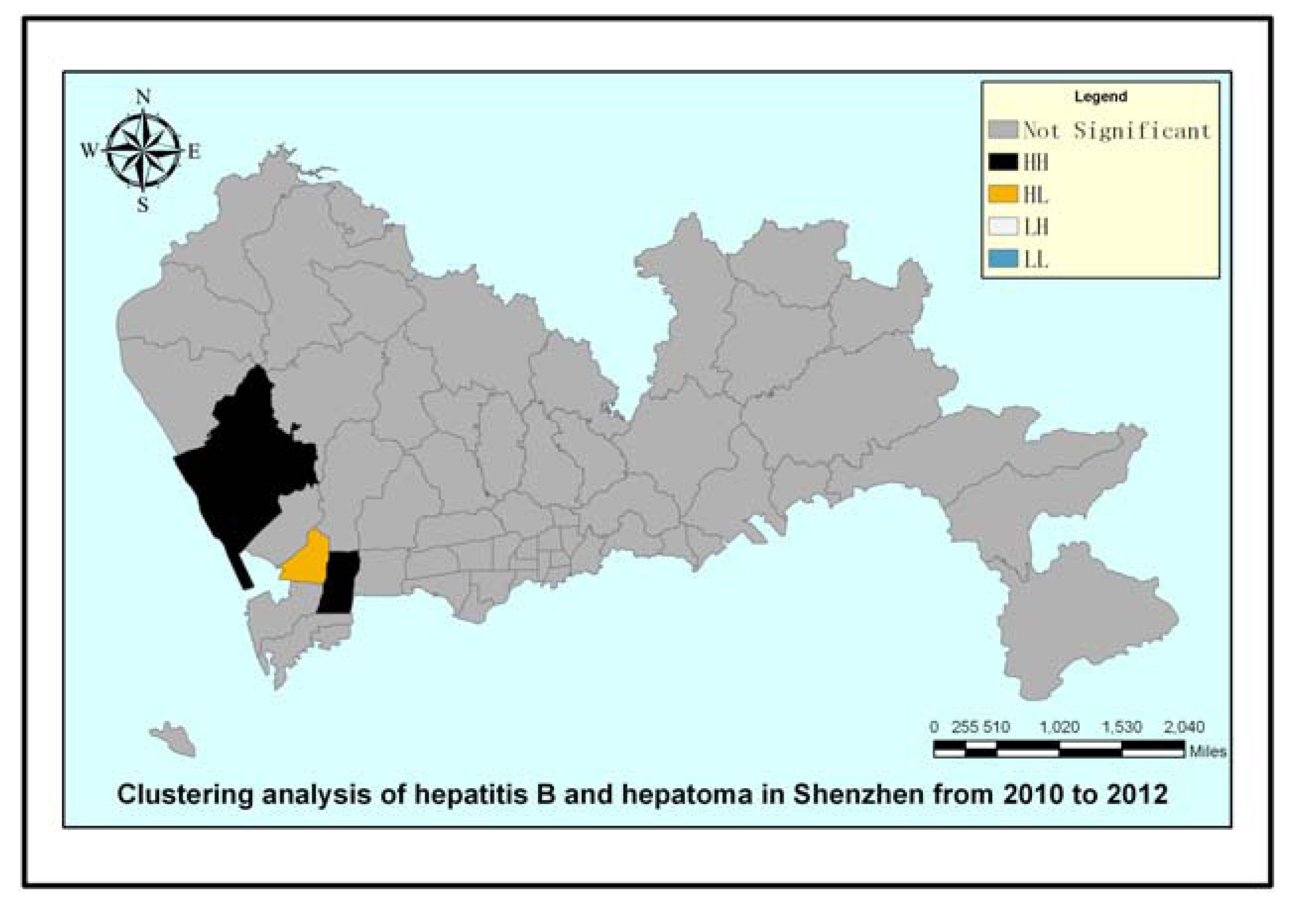 Clustering analysis of hepatitis B and hepatoma in Shenzhen.