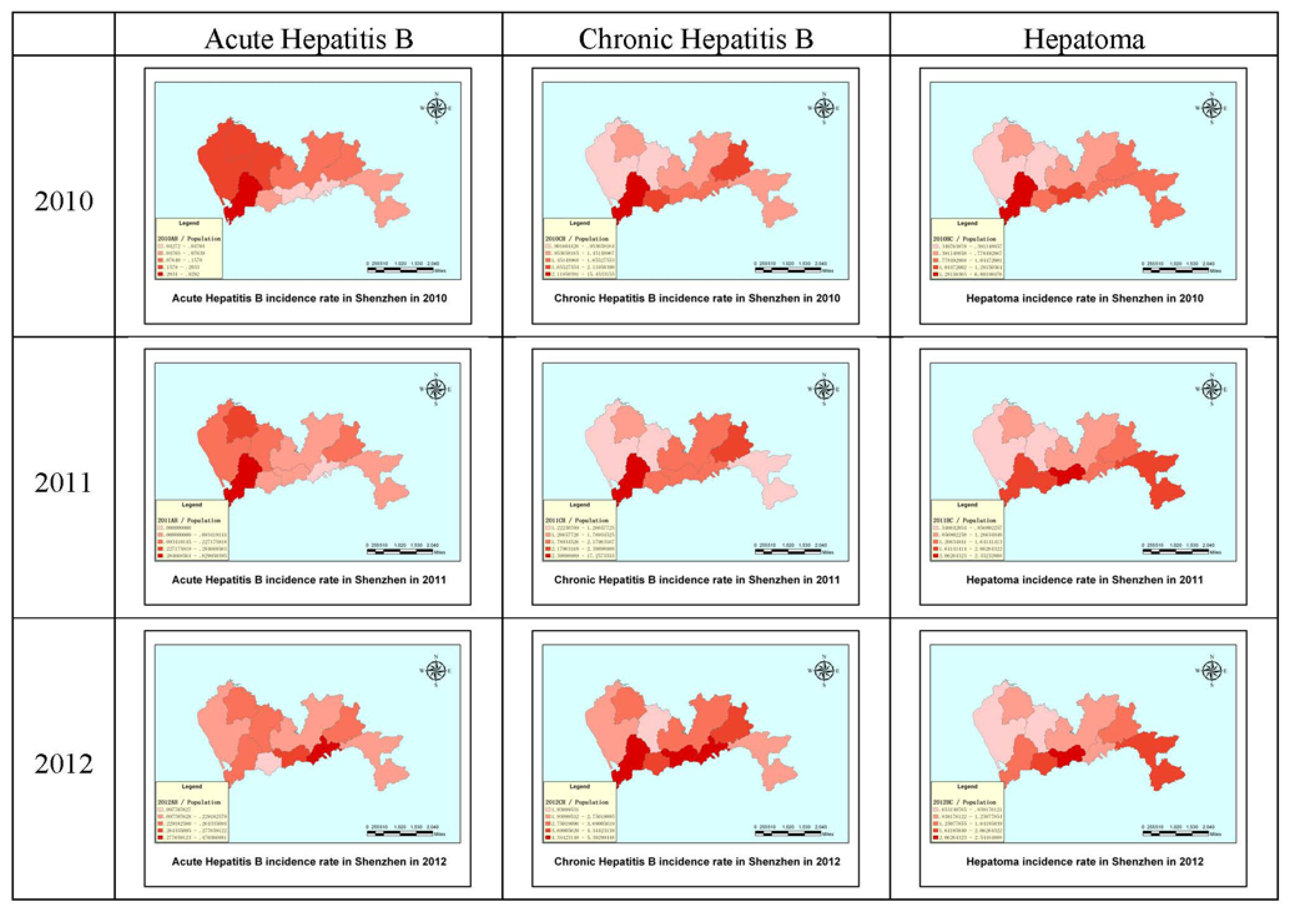 The disease incidence rate is the number of new cases per population in a given time period. As in Figure 5, the depth of the color represents density in Figure 6, with deeper colors indicating higher incidence rates. The incidence rate in the Nanshan district was higher than the other districts for all disease types in 2010, whereas the Baoan district and the Longhua new district had the lowest incidence rates for chronic hepatitis and hepatoma. The Luohu and Yantian districts had the lowest incidence rates of acute hepatitis in 2010. In 2011, the Nanshan district still had the highest incidence rate for acute and chronic hepatitis, but the Luohu district had the highest incidence rate of hepatoma. Compared with 2010, the areas with the lowest densities of disease remained basically unchanged in 2011. The 2012 map shows that the Nanshan district had the highest incidence rate of chronic hepatitis, whereas the Yantian and Luohu districts had the highest incidence rates of the other two diseases. We can clearly see that between 2010 and 2012, the disease incidence was in transition from west to east, which can provide the scientific basis for disease prevention and intervention in Shenzhen city. The incidence rates of the three diseases decreased significantly year to year.