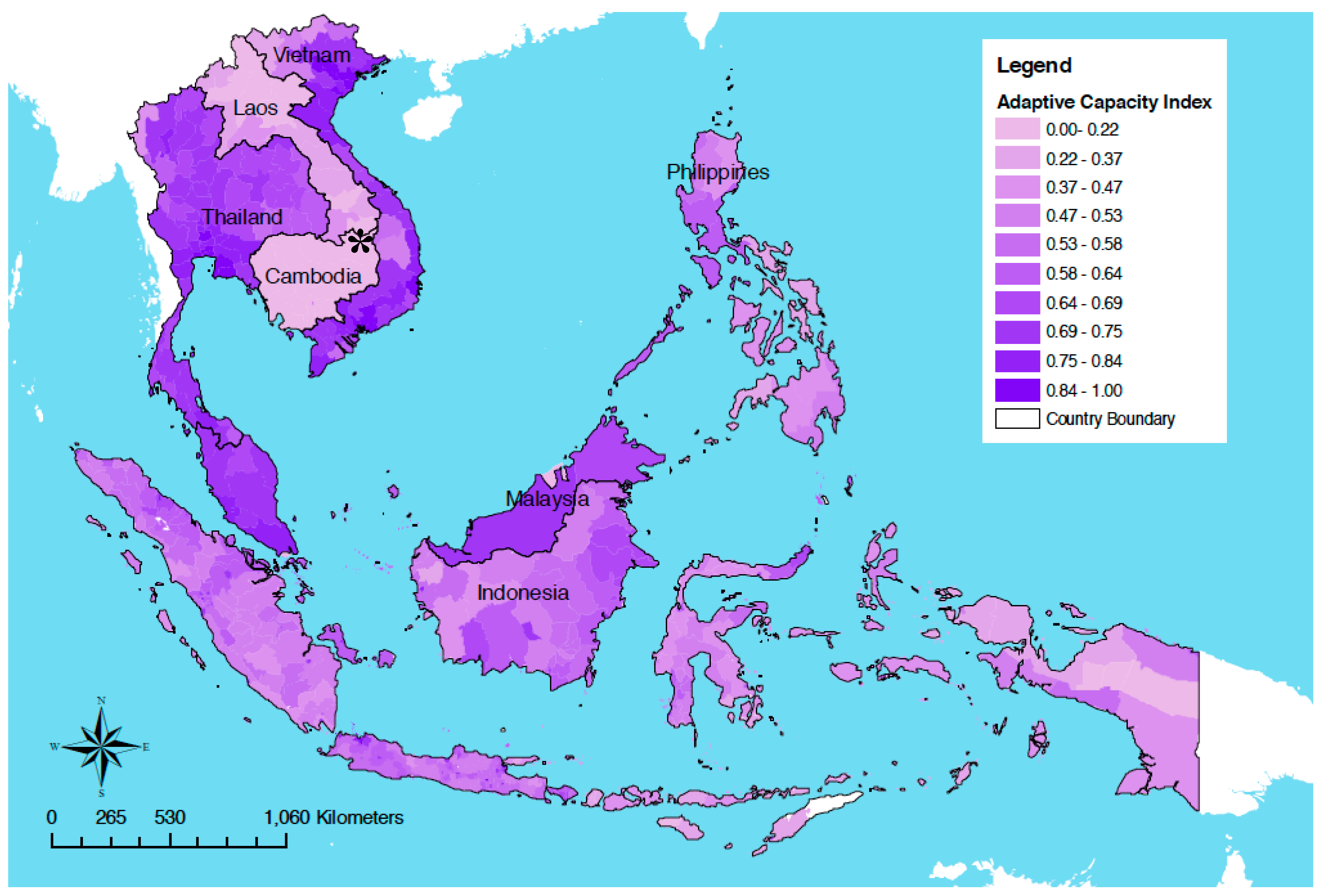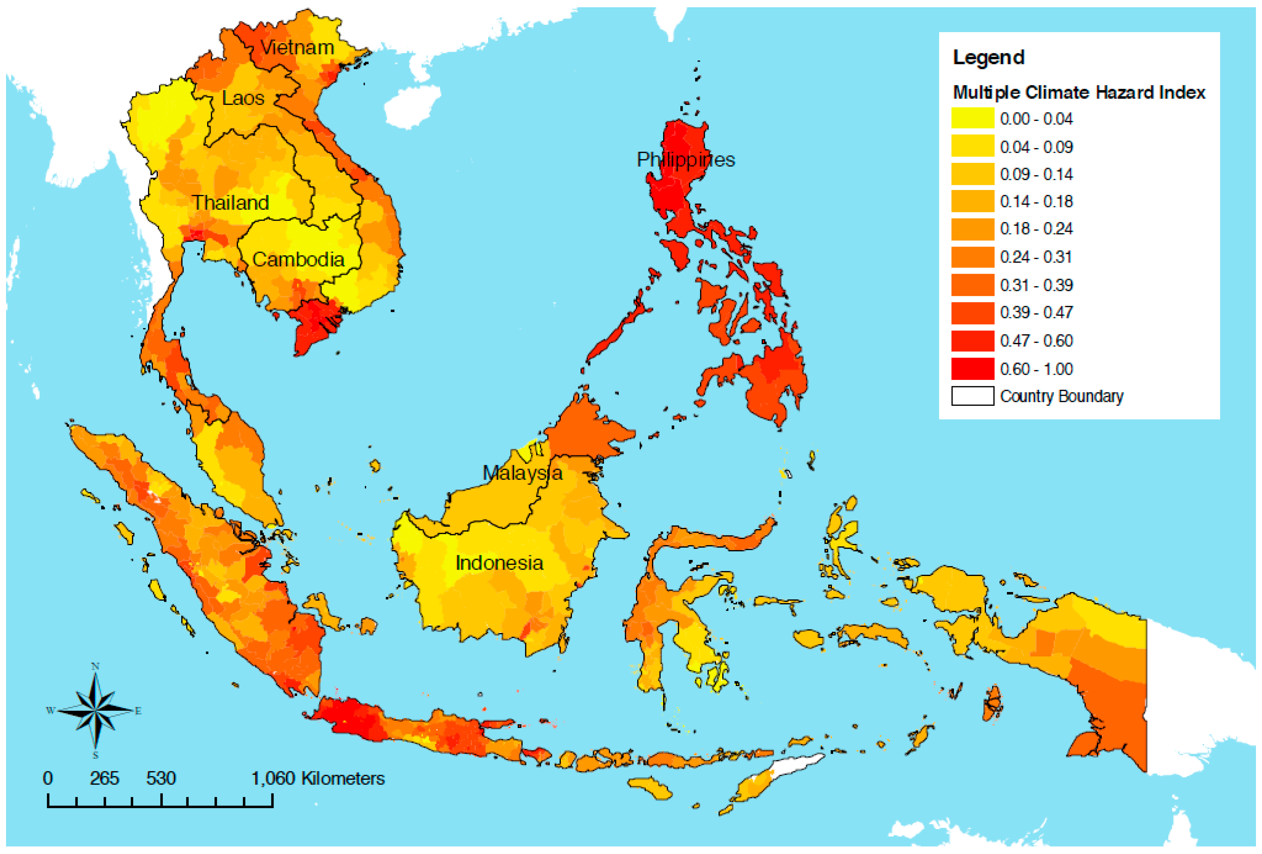 Map of vulnerability to climate change in Southeast Asia, taking into account exposure to climate hazards (tropical cyclones, floods, landslides, droughts and sea level rise), sensitivity and adaptive capacity. 0 indicates lowest vulnerability, 1 indicates highest vulnerability. Source: Reproduced with permission from Yusuf and Franciso [1].