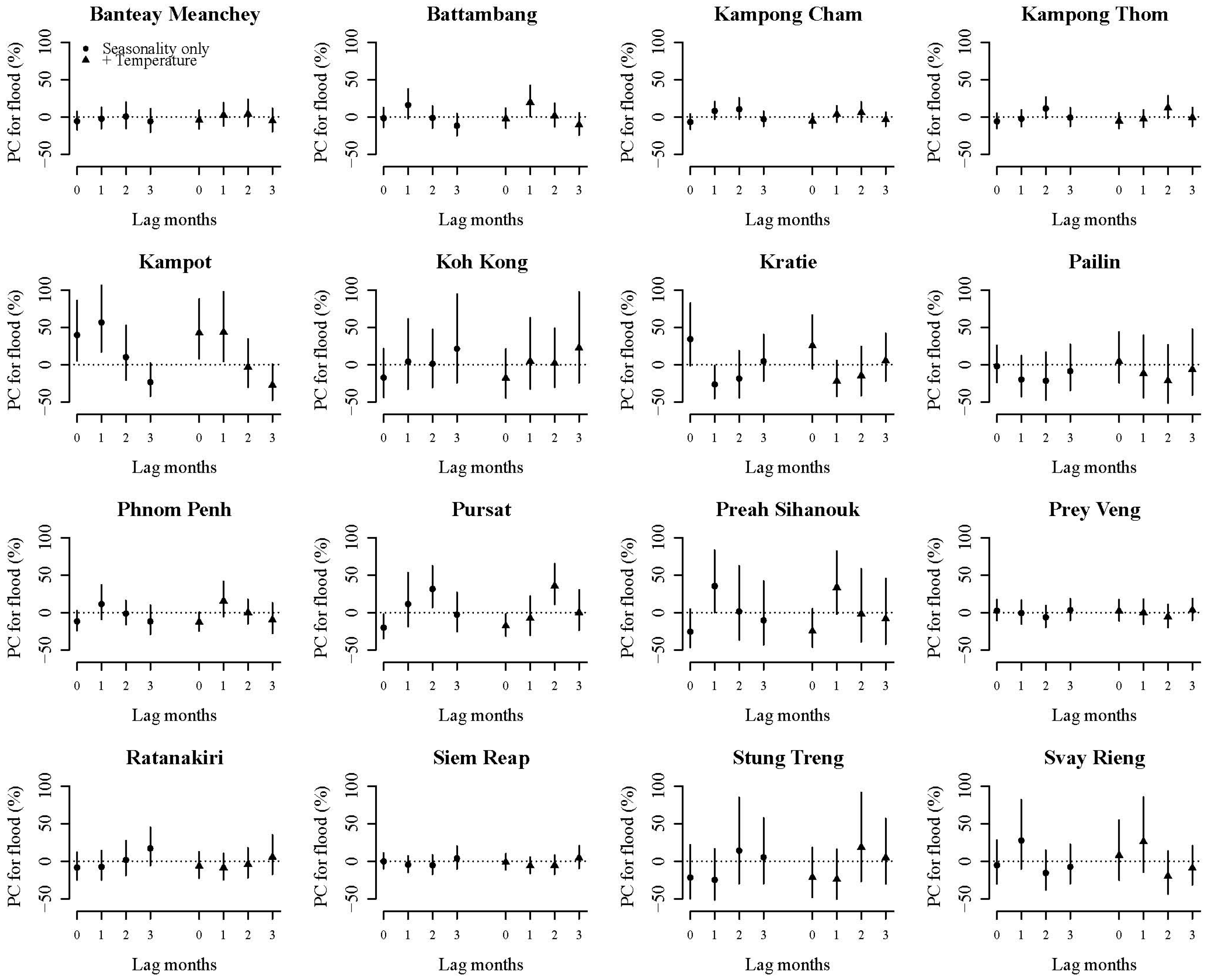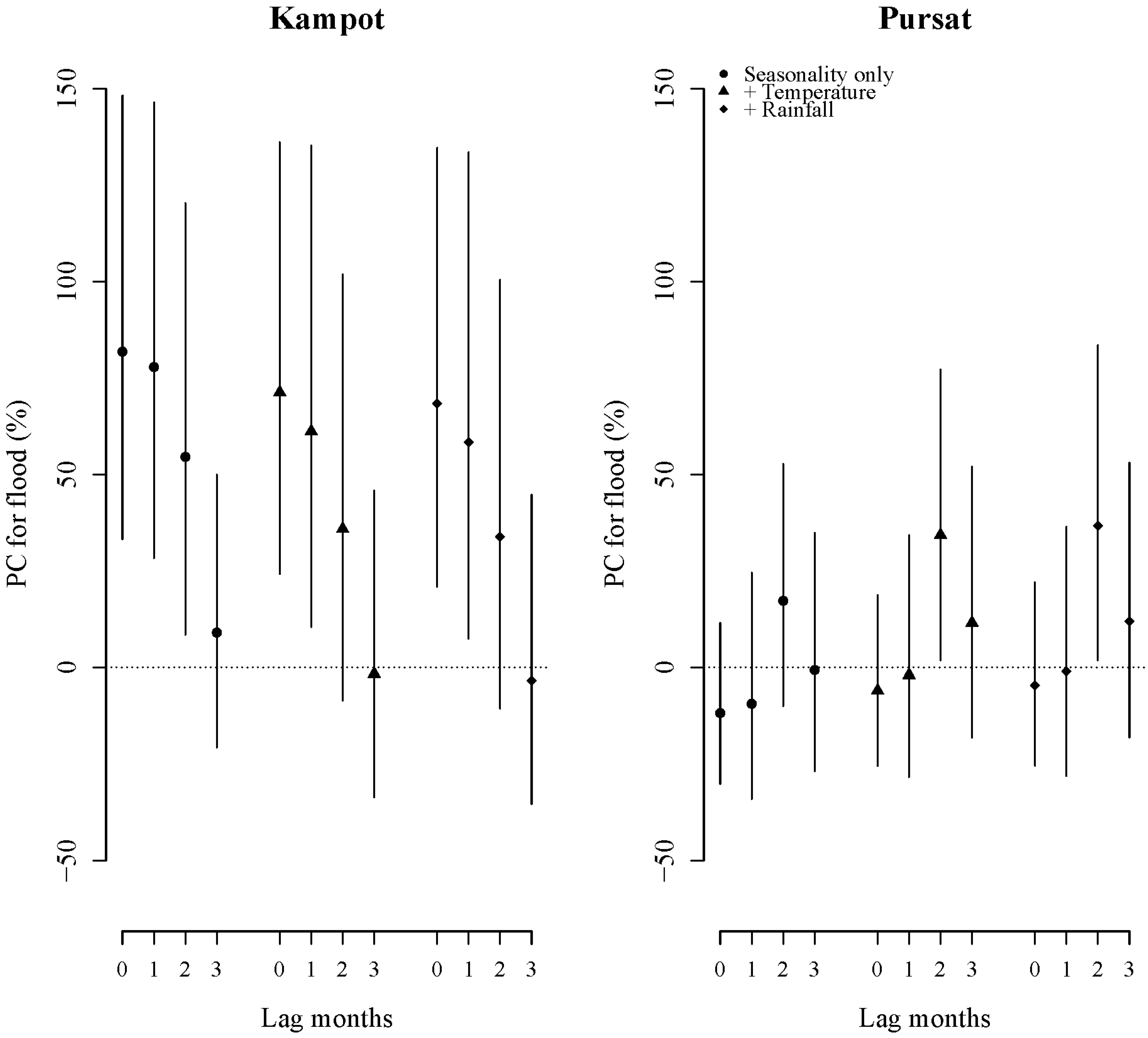 Although there is an abundance of empirical evidence in the international literature of increased incidence of water-borne disease related to extreme weather events such as floods, are results showed more heterogeneous effects of flooding on diarrhoea incidence that expected, with only two provinces demonstrating a statistically significant lagged relationship between flood events and diarrhoeal disease [16,21]. Although a strength of our study was the relatively long time-series analysis with multiple, nation-wide events, significant limitations included the need to define the temporo-spatial parameters of flood events, leading to a potential random measurement error of exposure. Furthermore, less severe cases of diarrhoea would presumably be less likely to be included; we assumed that this bias was consistent across the study period. A related source of bias in our findings lies in the tendency for many Cambodian people to visit private clinics or pharmacies for first-line treatment of many illnesses, including diarrhoea, thus our exclusive use of MoH notification data represents an unknown proportion of the total cases of diarrhoeal disease in the country. Finally, any potential misdiagnoses would potentially affect these study results; again, we assumed that diarrhoeal illness was defined and diagnosed consistently across the study period.