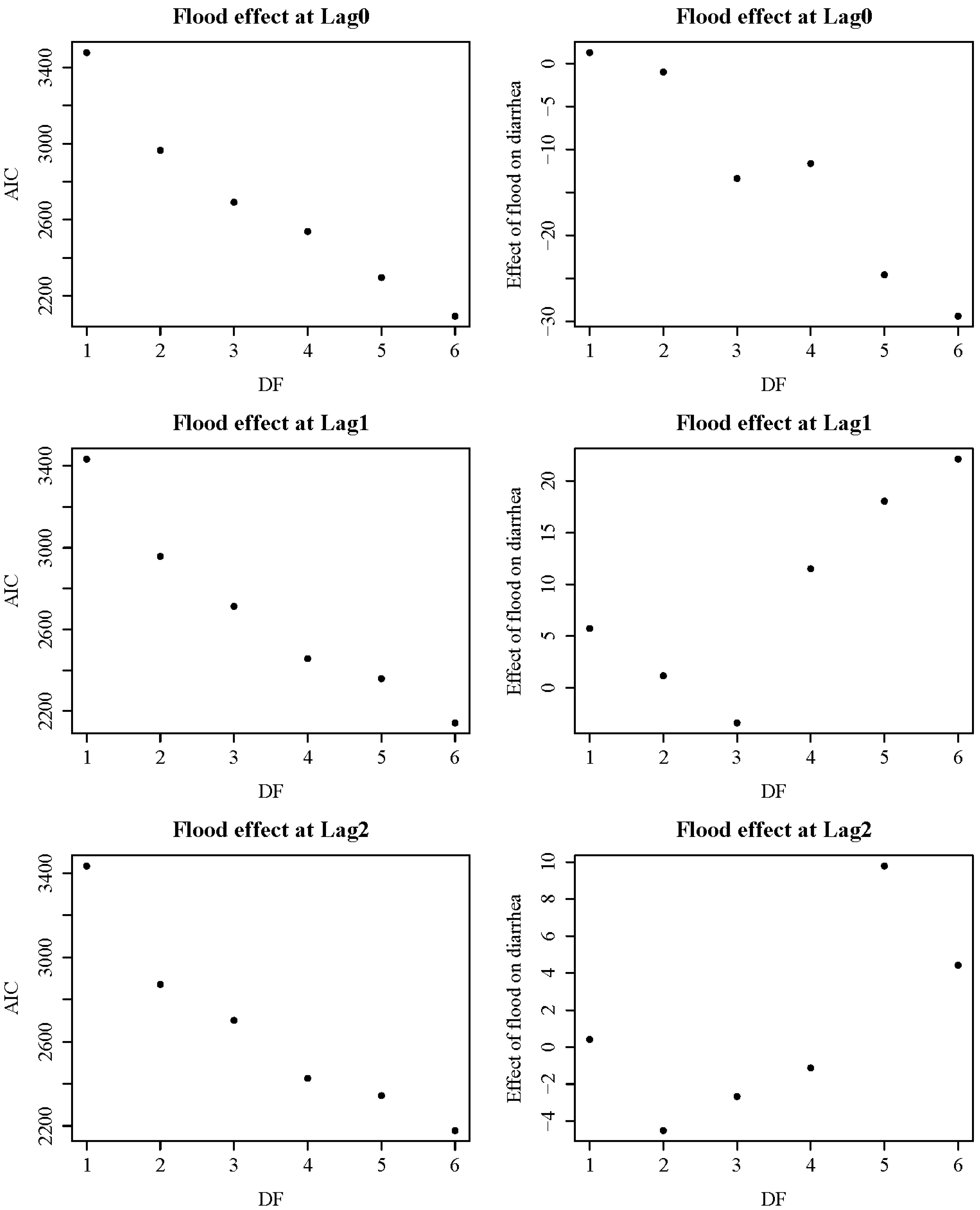 AIC and flood effect estimates on diarrhoea according to changing degree of freedom (DF) from one to six. We selected four degrees of freedom, showing smaller AIC and relatively stable effect estimate of flood on diarrhoea.
