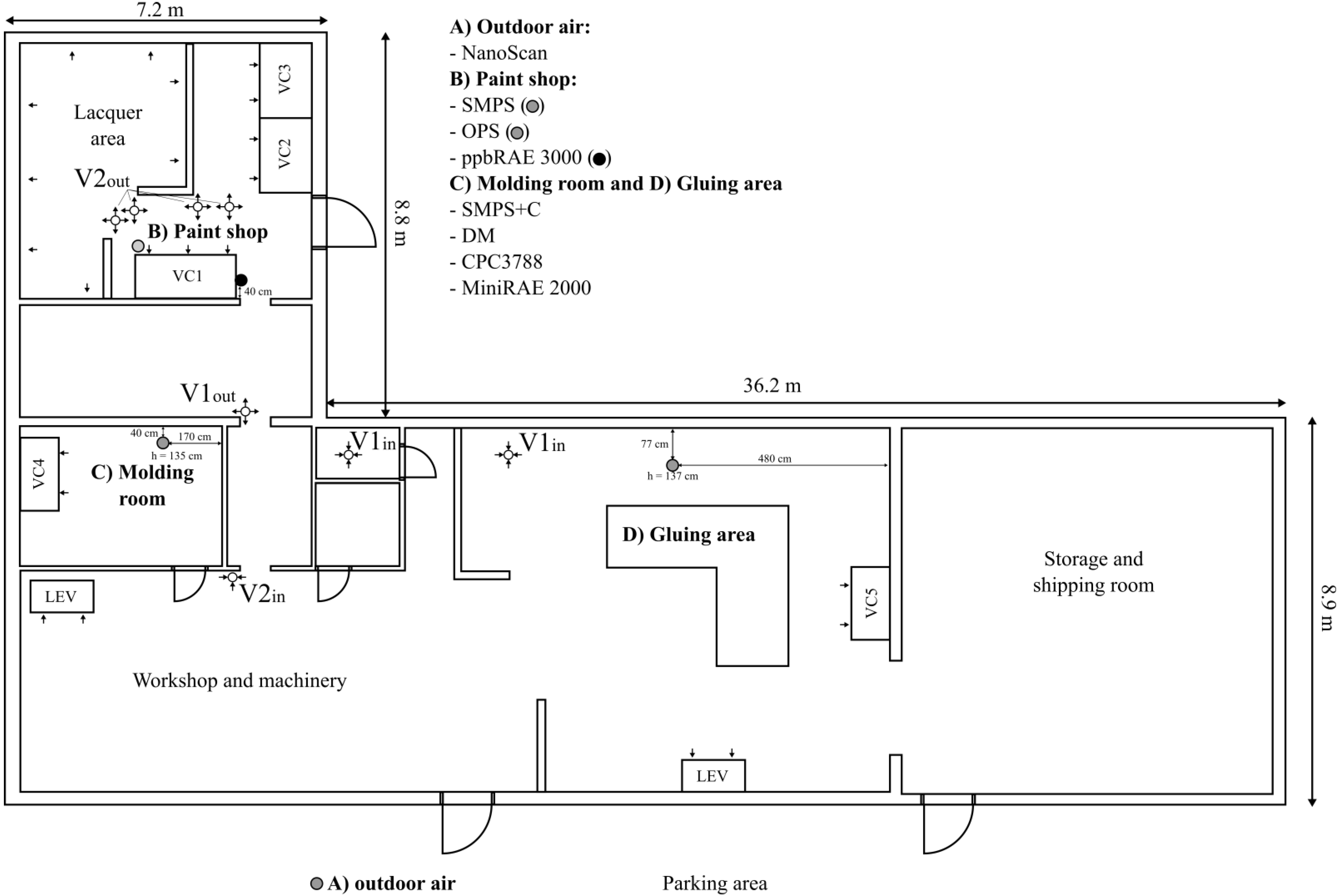 The workshop was located at a rural area in southern Finland and employed approximately 10 persons. In this study, the measurements were carried out in three main working areas: molding room, paint shop, and gluing area (Figure 1). The building ventilation was supported with mechanical exhaust ventilation systems (see arrows in Figure 1). The replacement air was drawn from outdoor air through the building shell and through the door at the paint shop which was open during most of the working hours. The indoor air was also mechanically circulated inside the workshop (see Figure 1; V1in–V1out and V2in–V2out). The doors between different working areas were open so the air could mix inside the whole workshop. The working hours were registered separately for each of these three locations. In our analysis we defined non-working hours as all times without working activities within the last 90 min anywhere in the workshop.