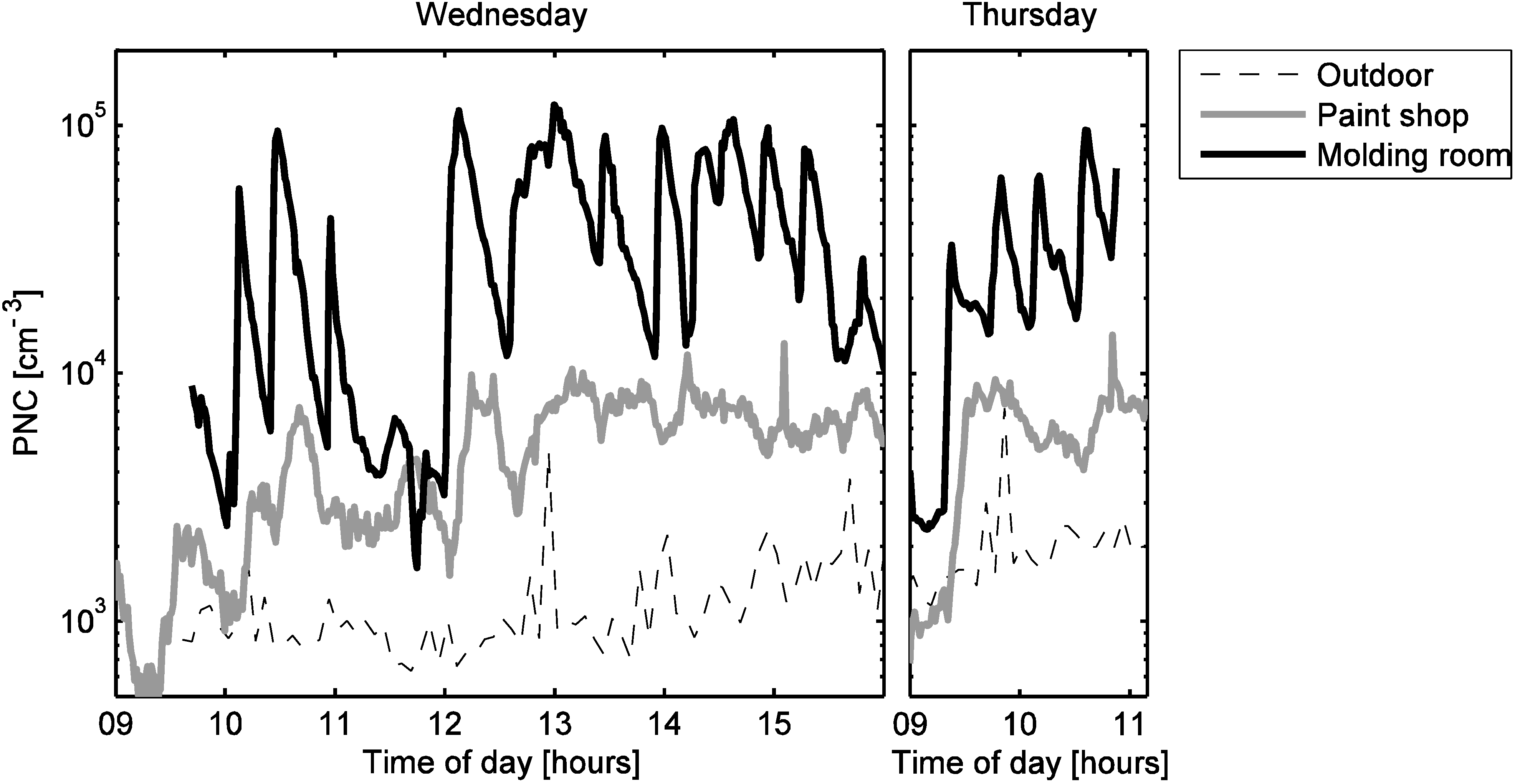 Particle number concentrations in the molding room, in the paint shop, and outdoors.