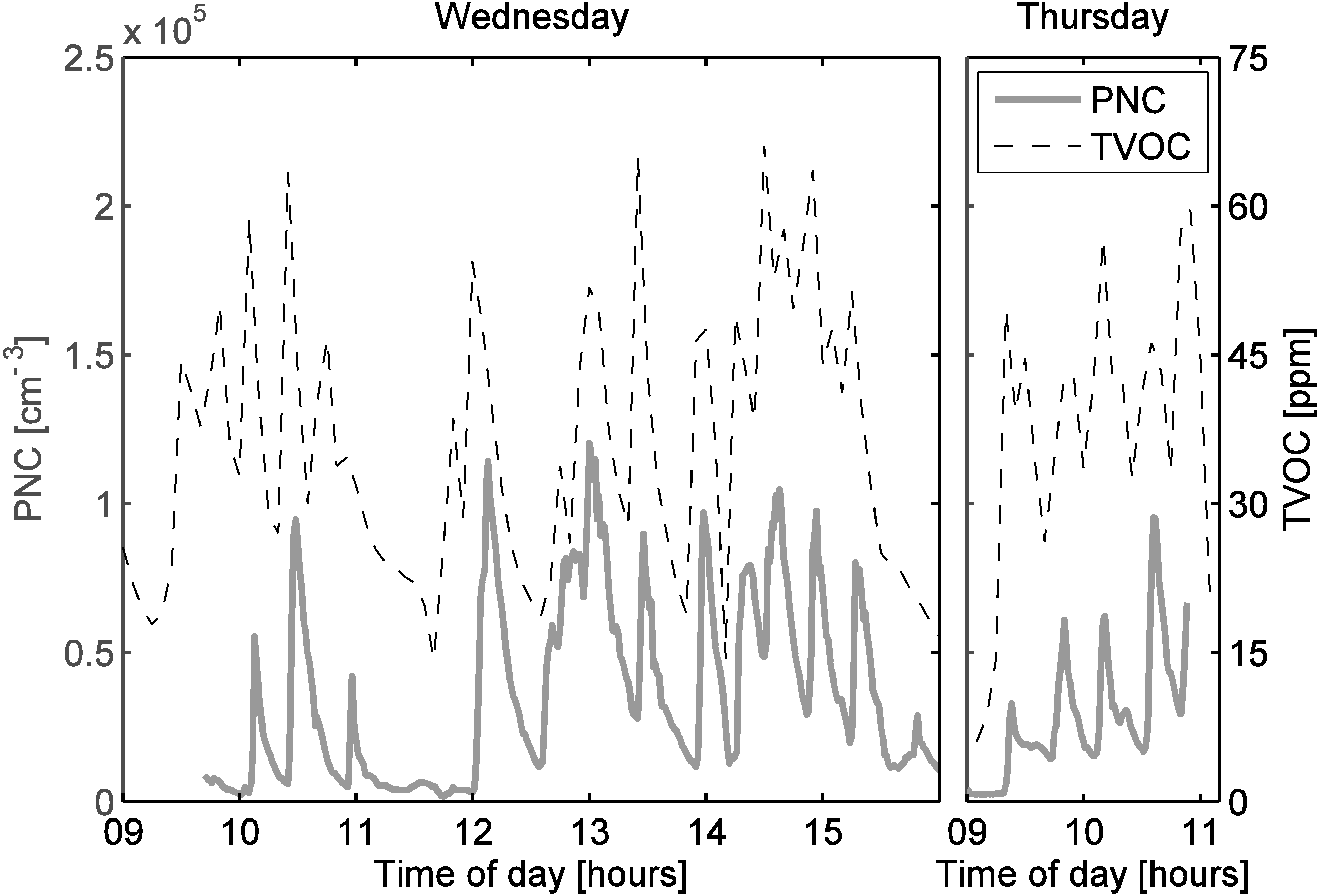 Particle and TVOC concentrations were measured continuously from Wednesday to Monday (13–18 November 2013). Temperatures measured by the Finnish Meteorological Institute at the nearest weather station ranged from −1 °C to 8 °C.