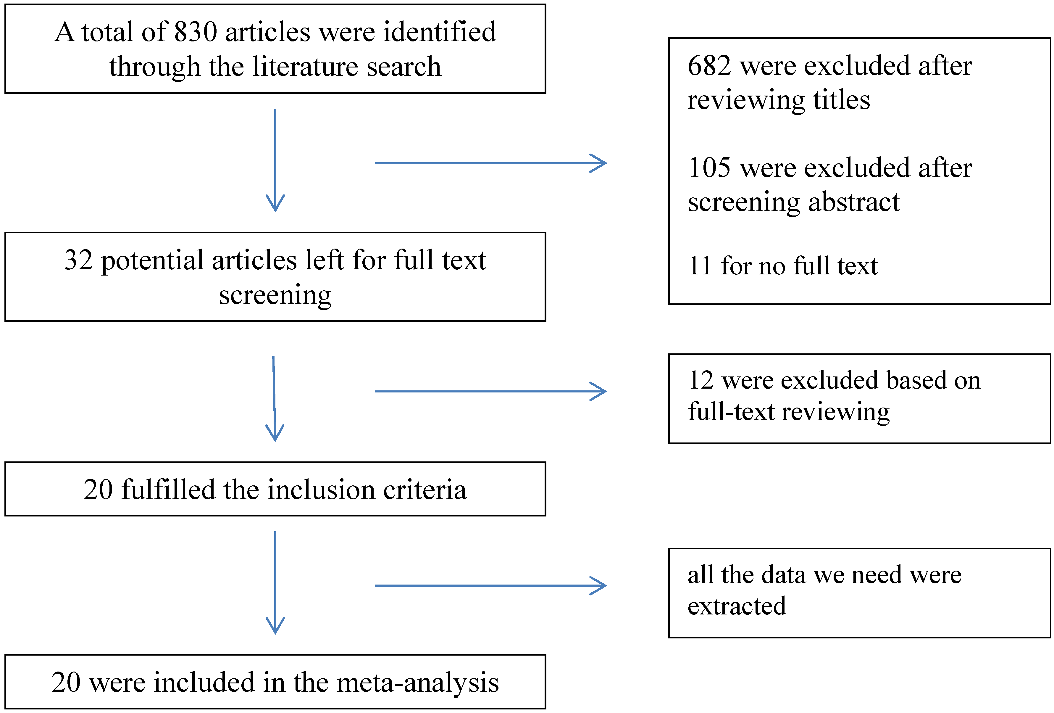 The results of all titles and abstracts were merged into the Endnote, and duplicates were removed. All abstracts and titles were screened by two independent reviewers (Hui Lian and Yanping Ruan) to delete the irrelevant citations. Full-text articles of the potential eligible studies that met selection criteria were downloaded and read for inclusion in the systematic review. The reviewers then compared the results. If different opinions appeared, the first step was discussing. When we could not reach agreement after discussion, arbitration was sought from a third reviewer (Zhongjie Fan).
