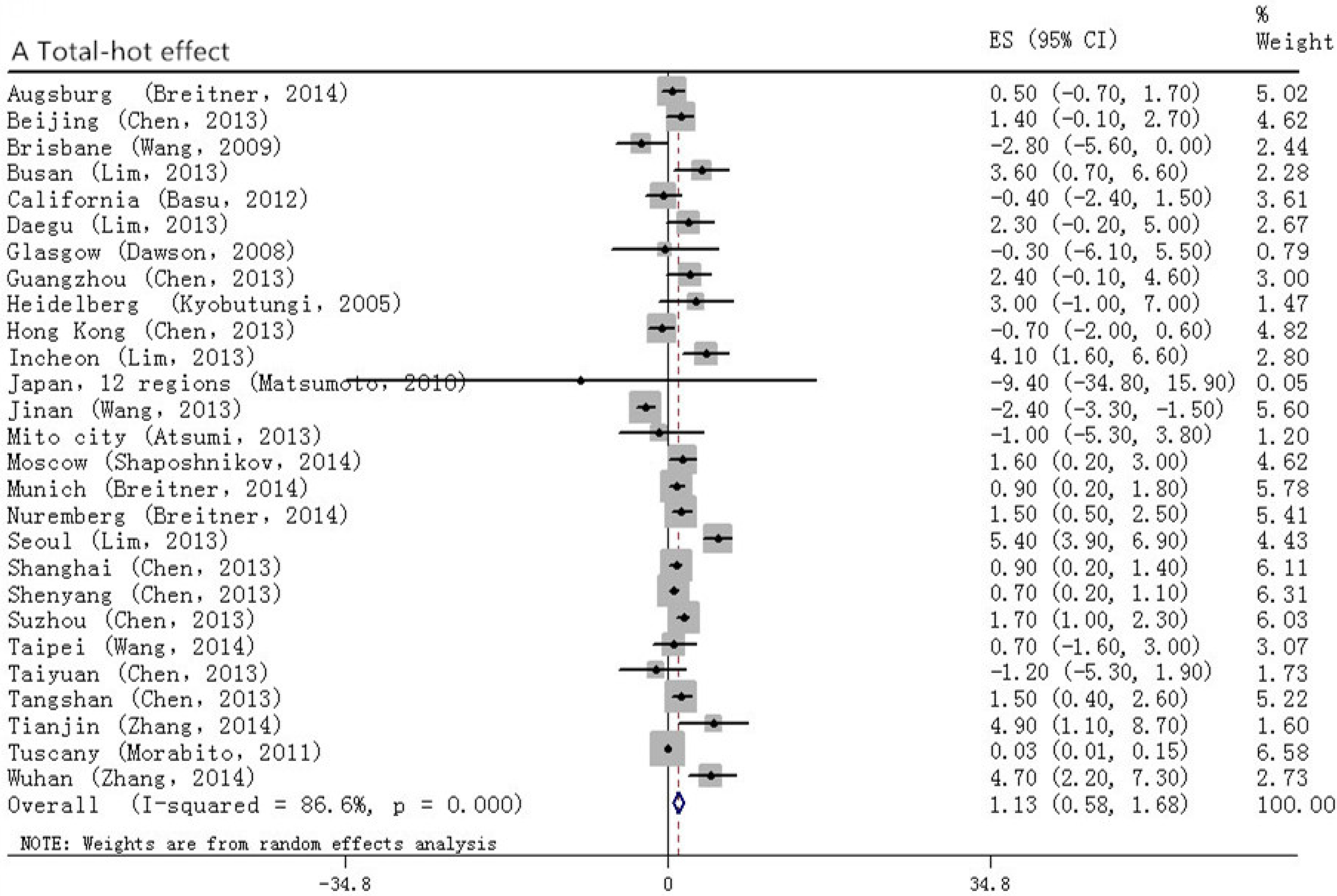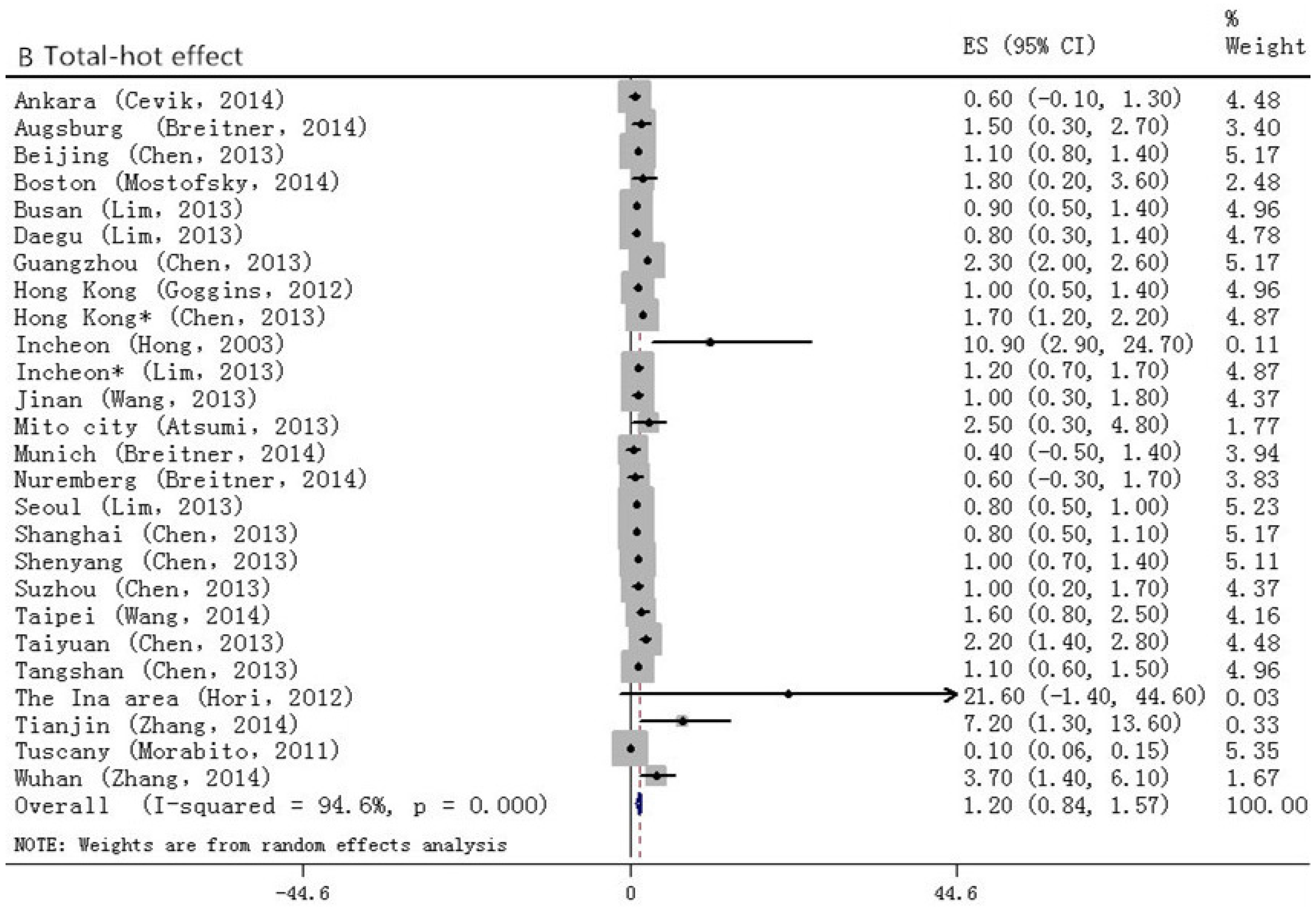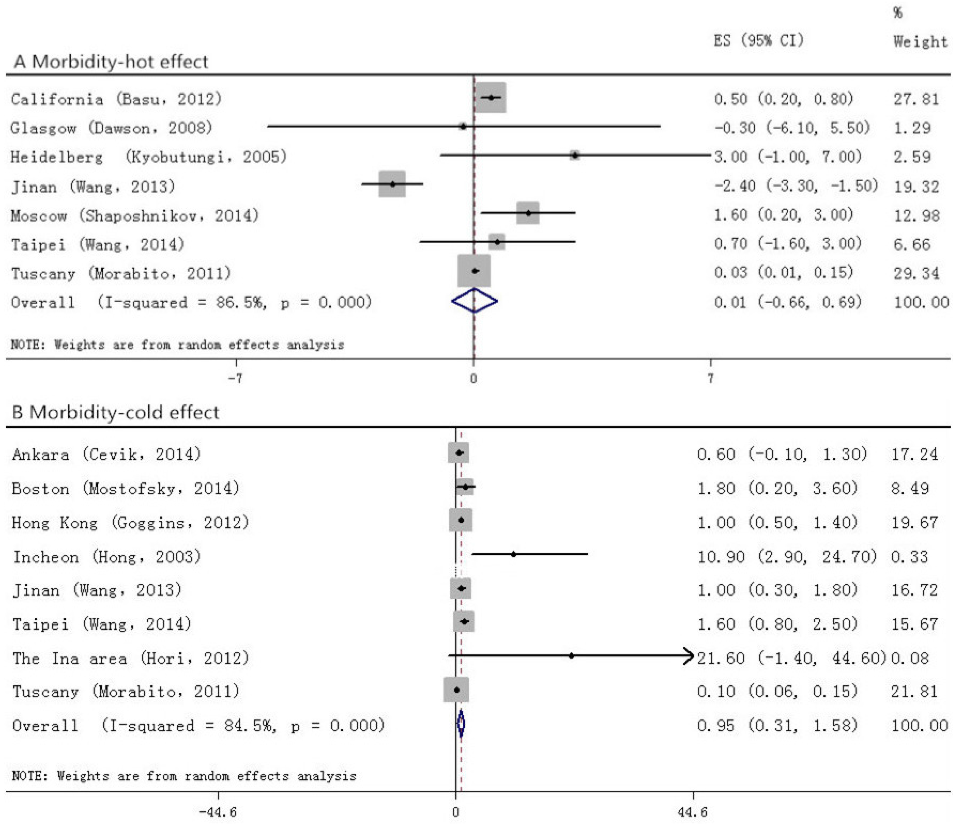 We separately calculated the cold and the hot estimate effects, as all of the studies included in our analysis did. The statistical analysis includes 2 stages: in the first stage, we converted all effect estimates into a relative risk; in the second stage, we obtained the ultimate effects using the meta-analyses.
