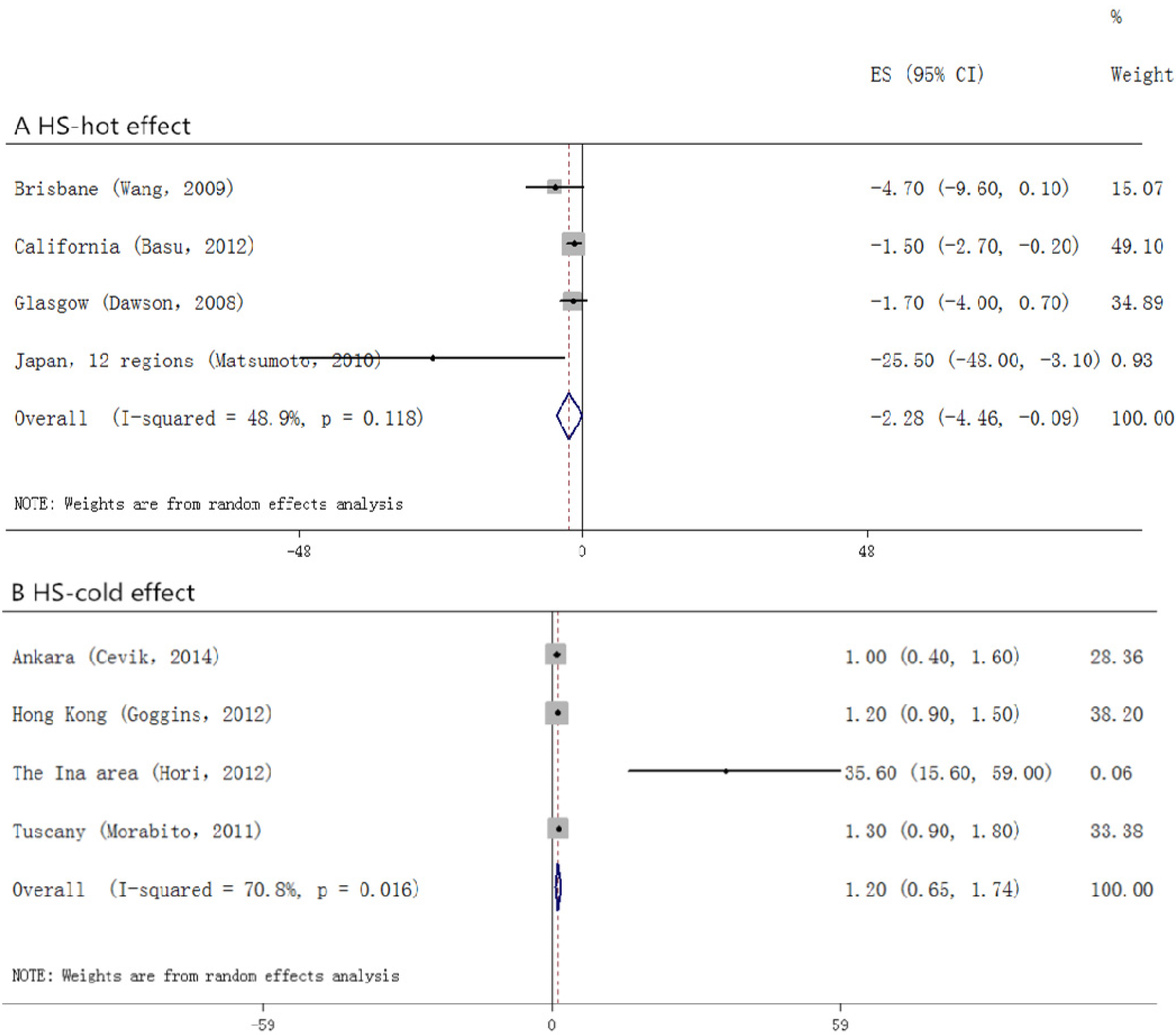 Forrest plots for relationship between the temperature change and HS. A and B stand for hot and cold effect, respectively.