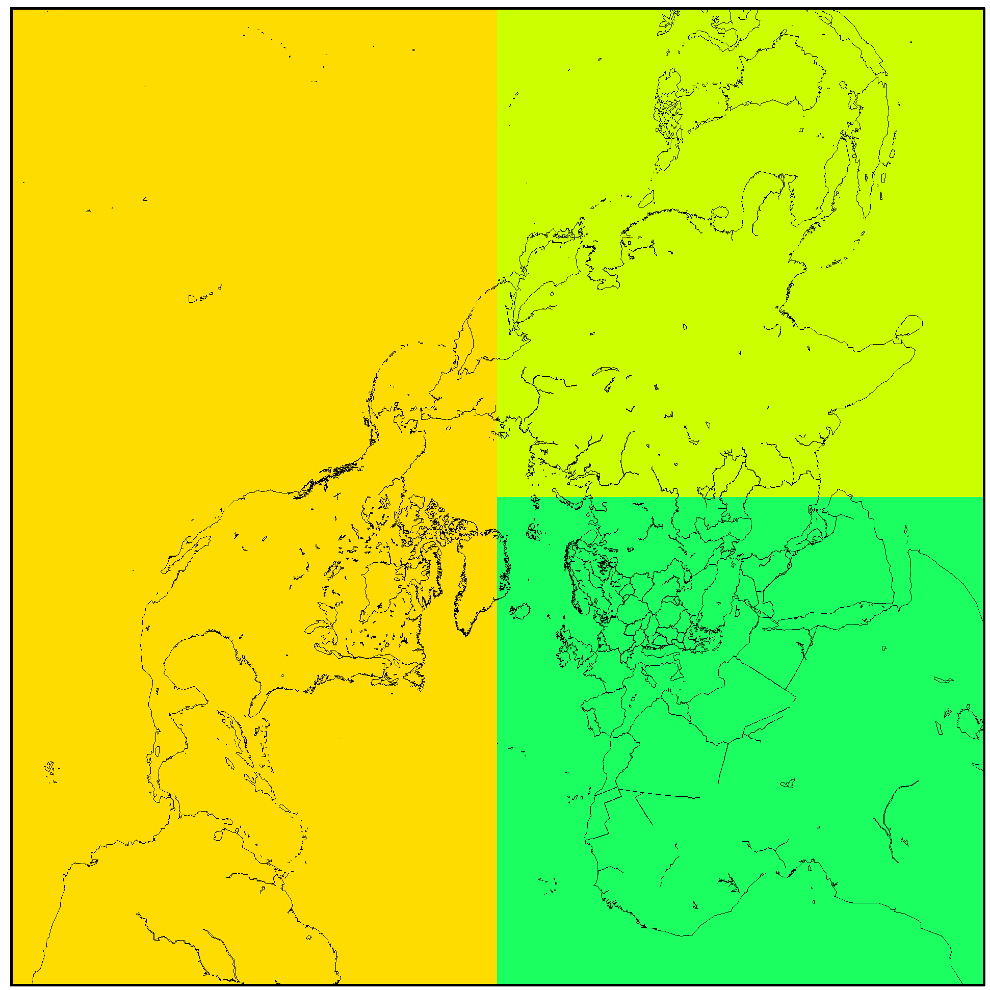 The DEHM model domain, including the sub-division into the major source areas North America (orange), Europe (dark green) and Asia (light green), applied in Section 3.2.