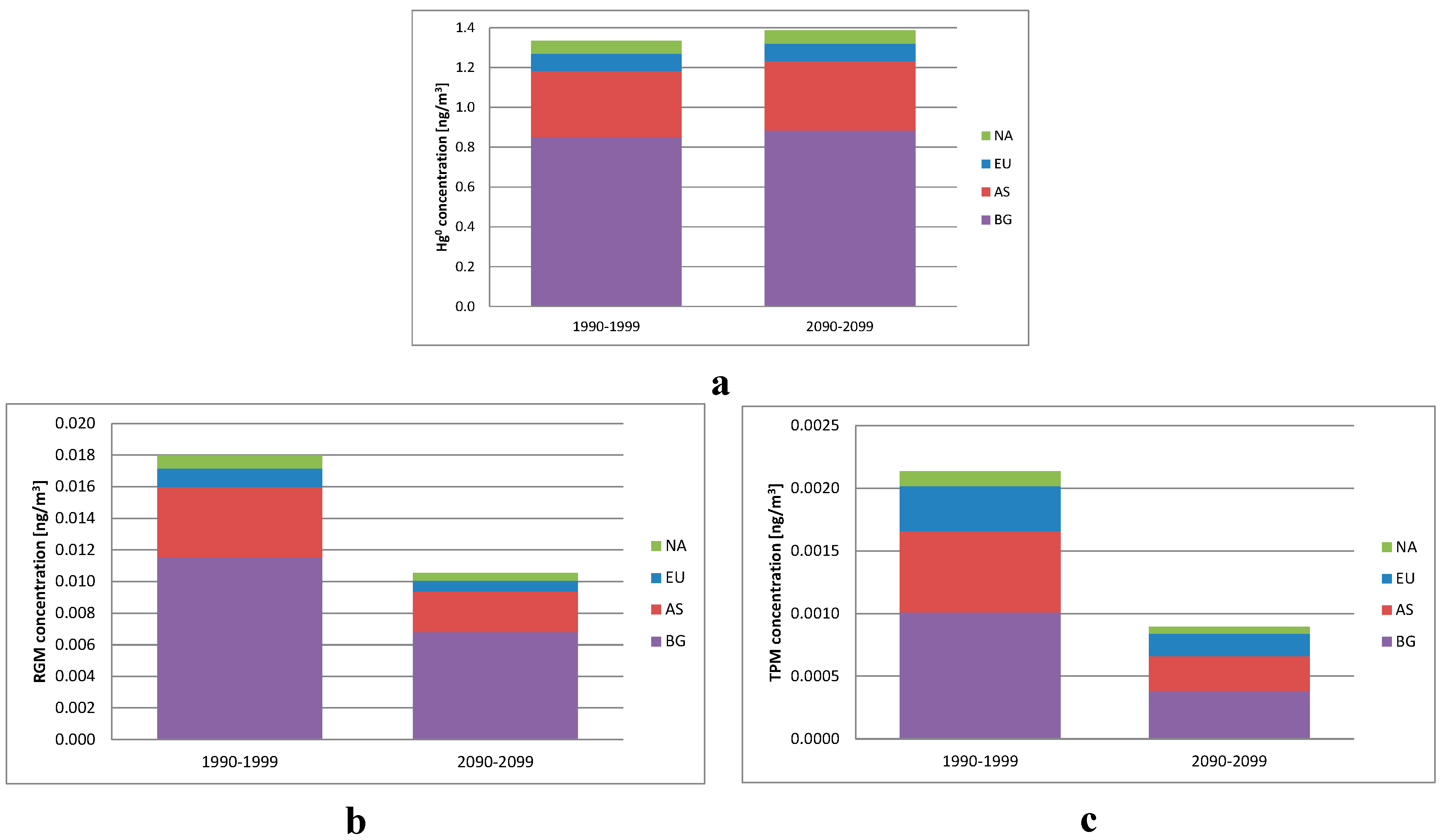 The average Artic air concentrations of Hg0 (a), Reactive Gaseous Mercury (RGM = HgO + HgCl2) (b) and Total Particular Mercury (TPM = primary + oxidized particulate Hg) (c) for the 1990s and 2090s divided into the contribution from North America (NA), Europe (EU), Asia (AS), and background concentration (BG).