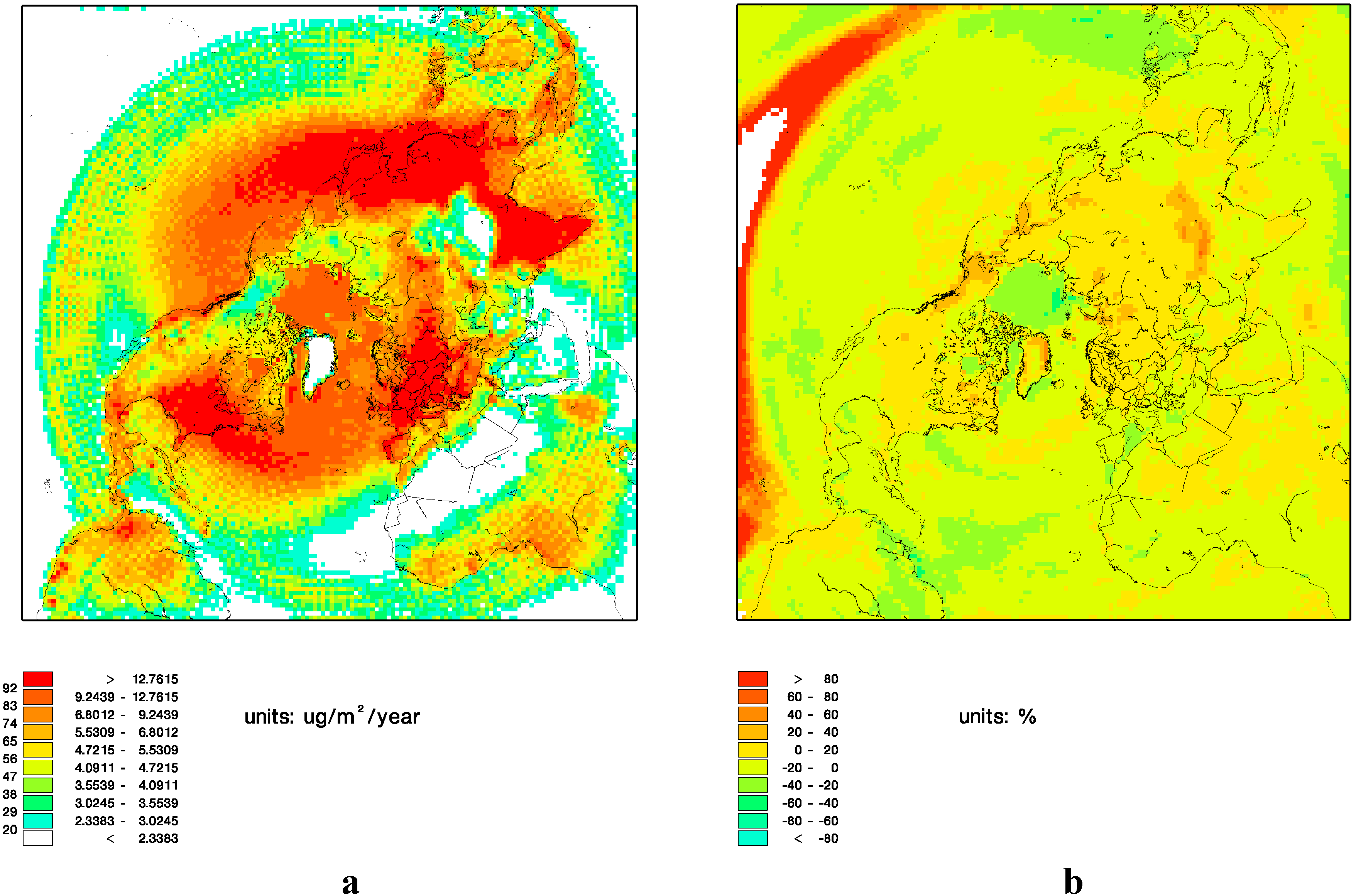 Average of the total annual mercury deposition for the 1990s (a) and change in deposition in percent from the 1990s to the 2090s (b).