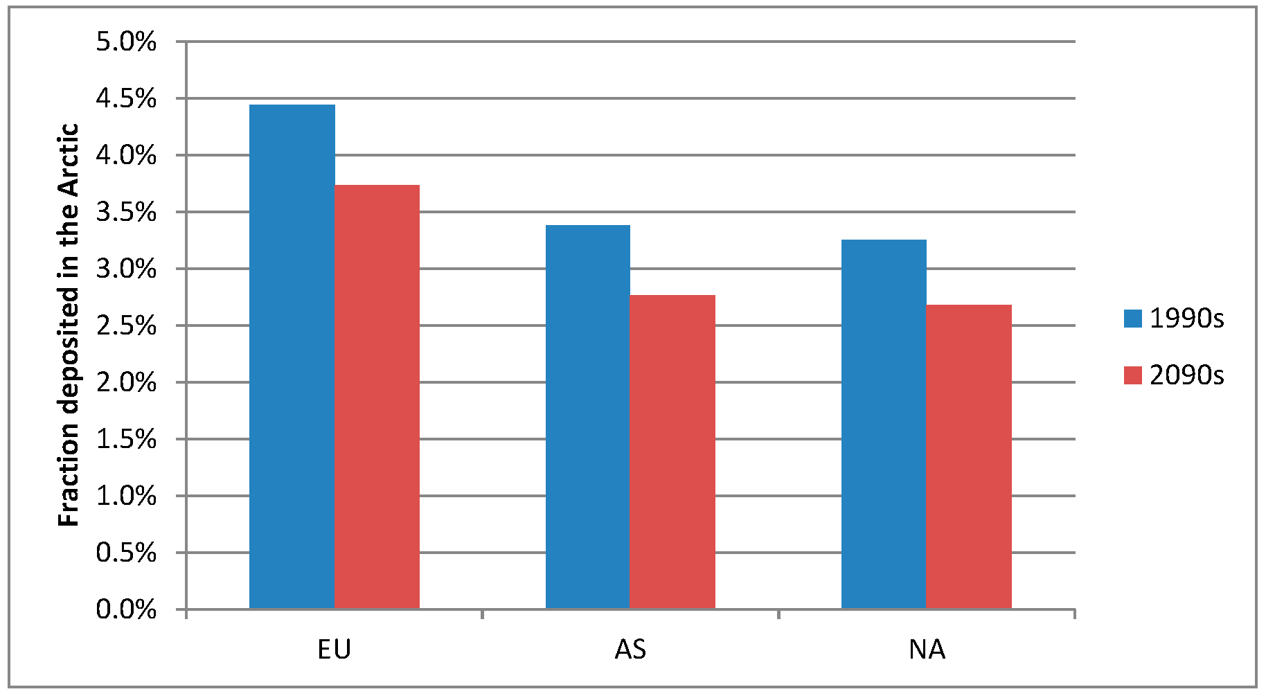 The relative contribution to the deposition is also shown in Figure 3 and these are quite similar to the relative contributions of Hg0 concentrations as described above, reflecting that Hg is mainly transported to the Arctic as Hg0 which is oxidized to RGM and particulate Hg during the transport and some of this oxidized Hg is deposited. The larger atmospheric transport of TPM in the 2090s than in the 1990s is so small compared to the Hg0 that it does not influence the overall relative contribution distribution. The global background is the most important contributor. There are only very small differences (<0.2%) in the relative contributions for the two decades indicating that climate change do not have a large influence on the relative contribution of the source areas. All the source areas in the Northern Hemisphere contributes to a large background pool of Hg0 and this is getting well mixed before the Hg is deposited because of the long lifetime of Hg0 in the atmosphere (1 year). However, there are some differences between the source areas in how large a fraction of the total emission that is deposited in the Arctic (Figure 5). Europe is relatively the most important source area from which around 4.4% of the total Hg emission is deposited in the Arctic in the 1990s, while it is 3.3% for Asia and 3.2% for North America. This shows that the emissions from Europe are more efficiently transported to the Arctic compared to emissions from Asia and North America, which are both located more southerly and in addition have a longer transport pathway before they arrive in the Arctic. Common for all three source areas is that these fractions are lower in the 2090s compared to the 1990s (3.7%, 2.7% and 2.6% for EU, AS, and NA, respectively), corresponding to 16%–18% lower. This is due to the lower deposition owing to the lower sea-ice fraction in the 2090s than in the 1990s.