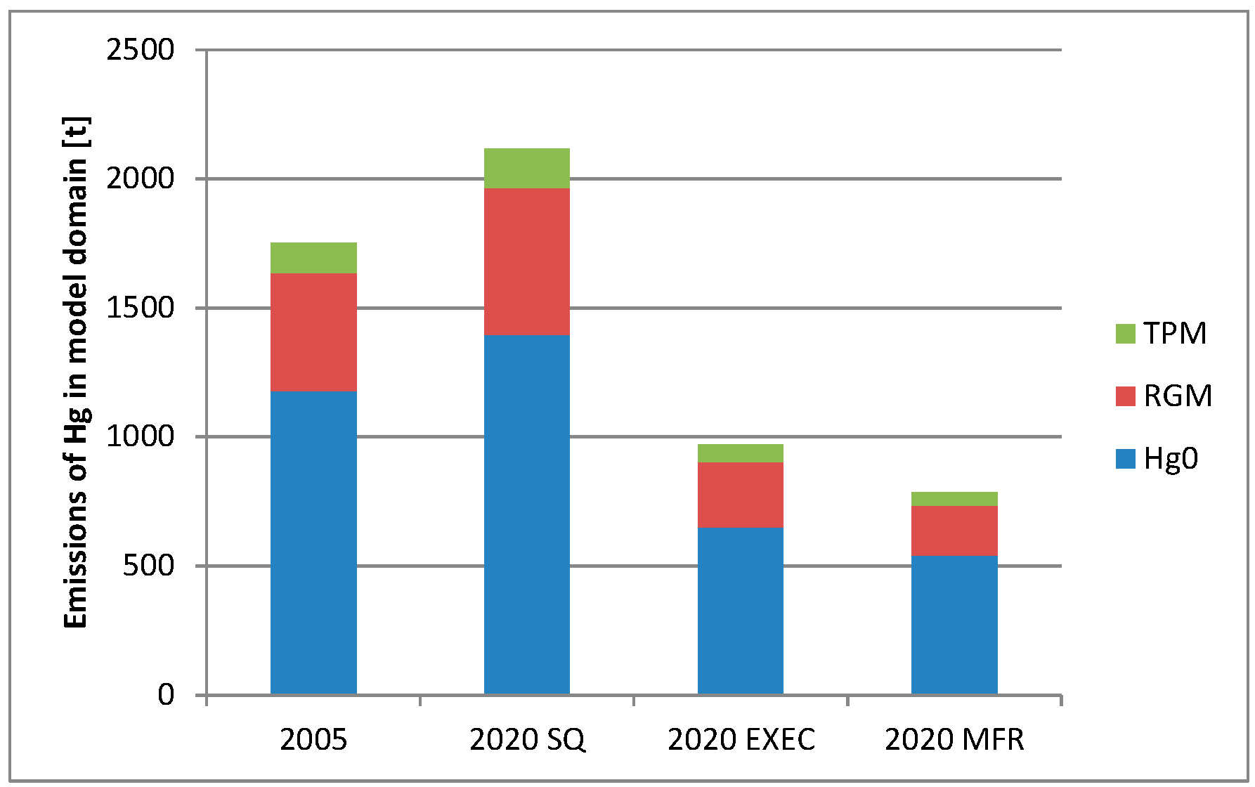 The total annual emission in tons Hg within the model domain for the four different emission scenarios, split up in emission of Hg0, reactive Hg (RGM) and particulate Hg (TPM).