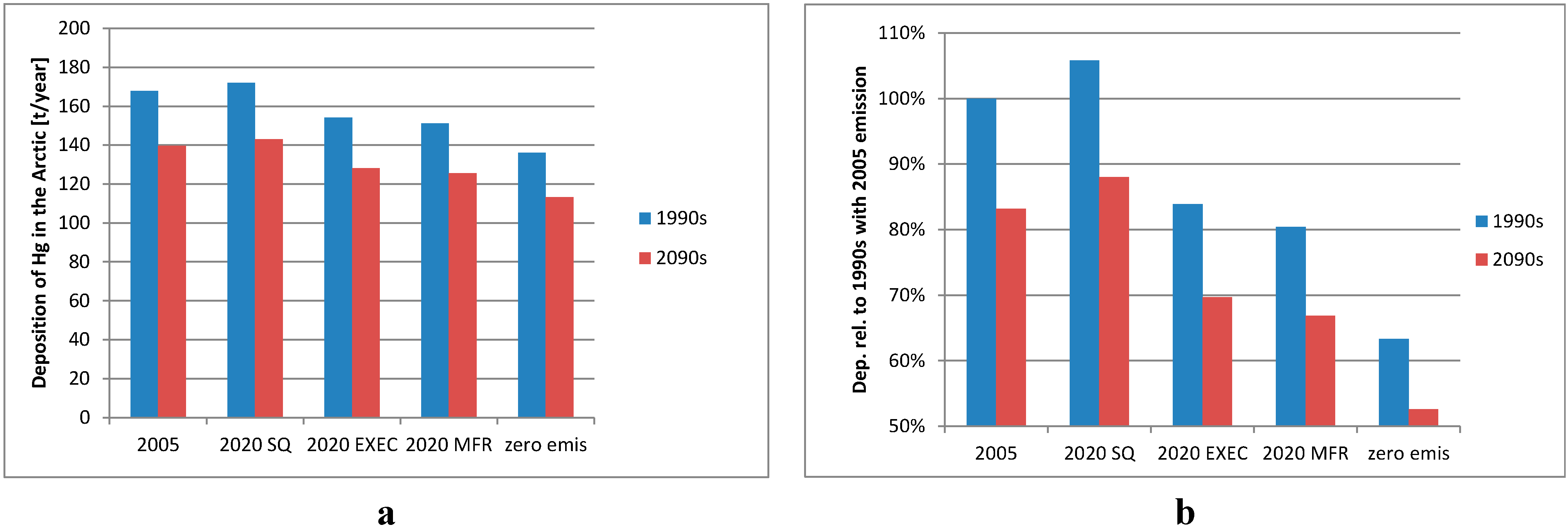 Total mercury deposition in Tons Hg/year to the Arctic for all different emissions scenarios from DEHM (a) and the relative difference in % (b) for the 1990s (blue) and the 2090s (red).