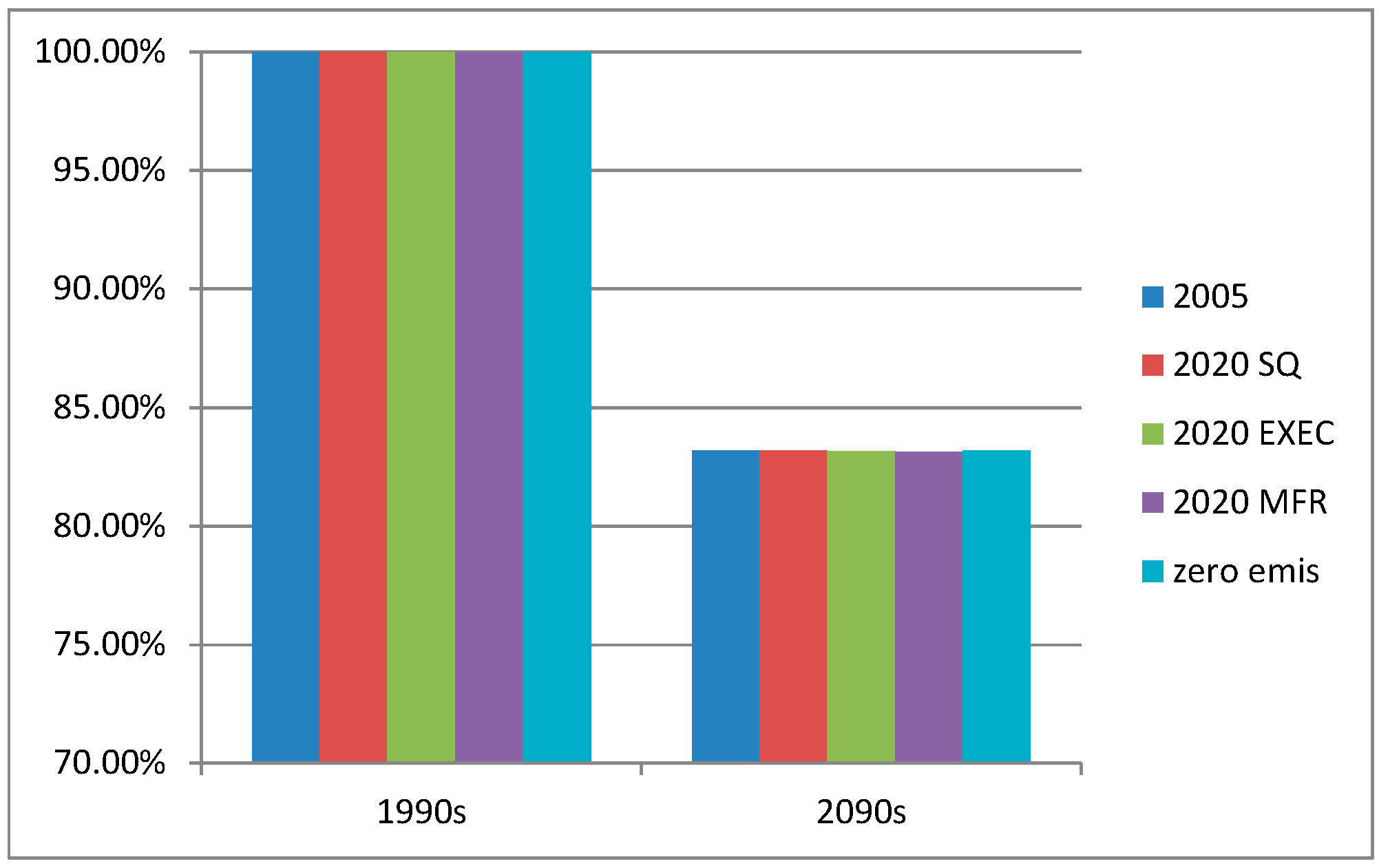 The relative change in Hg deposition to the Arctic between the 1990s and the 2090s is 18% for all five emissions scenarios (Figure 8). The changes in deposition for the future climate scenario are thus not influenced by the differences in emissions just as for the major source areas.