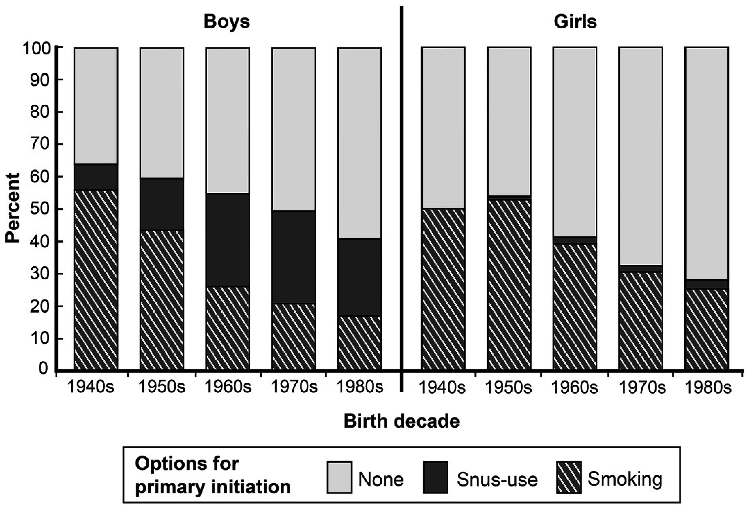Among males born in the 1940s, a large proportion initiated daily tobacco use through smoking and a rather small proportion through snus use. Among those from later birth decades, primary initiation of daily snus use steadily increased along with decreased primary initiation of daily smoking and increased proportions never becoming daily tobacco users. In the cohort born in the 1980s, a majority of the boys never became daily tobacco users, and most of the boys who did initiate daily tobacco use started with snus use, with very few starting with smoking.