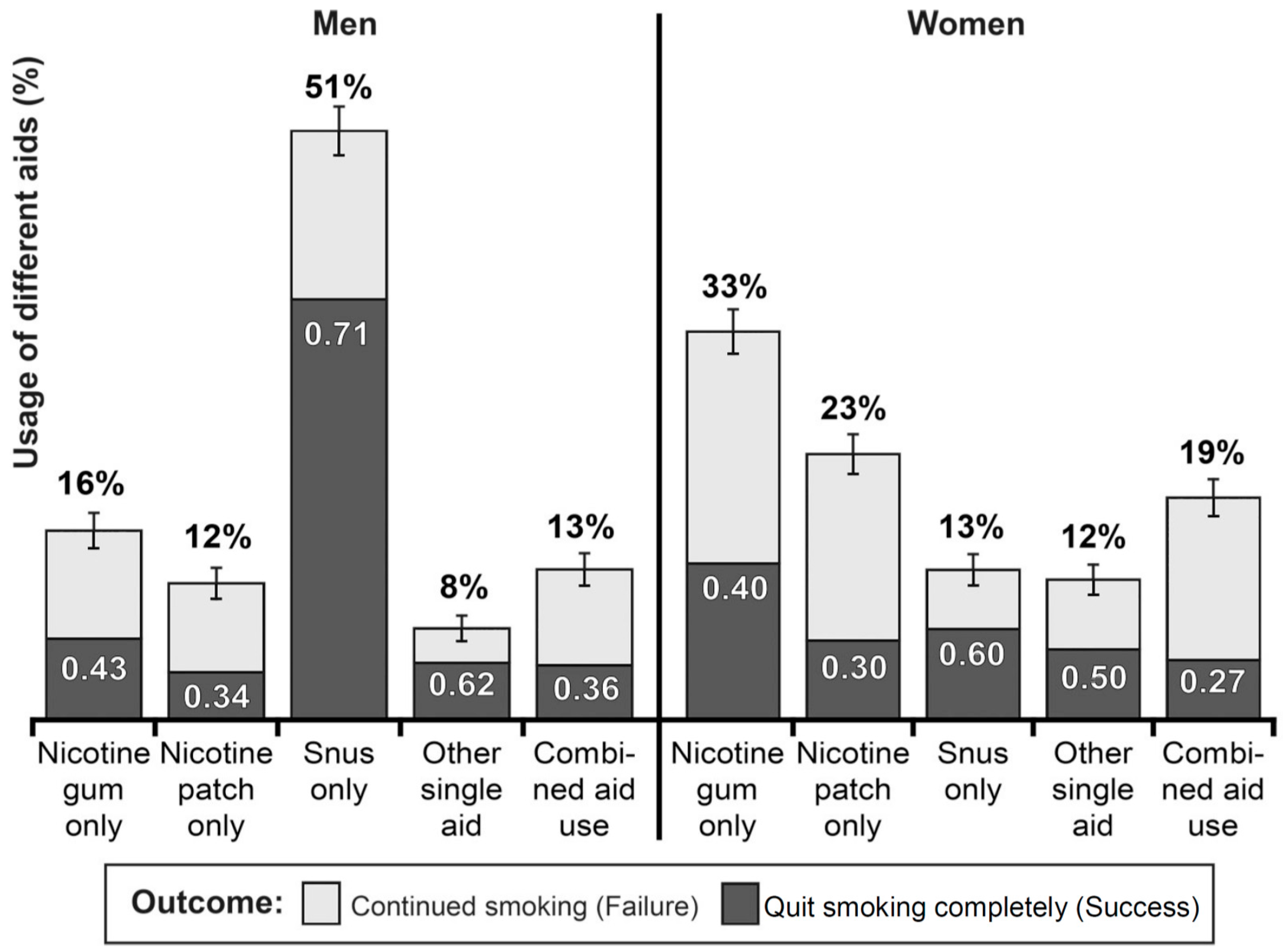 Among men, snus is the most commonly used self-treatment product, but among women, nicotine gum or patch is more common. The outcome of quit attempts with different aids shows that use of snus as cessation aid yields higher success rates than any of the other alternatives—for both men and women.