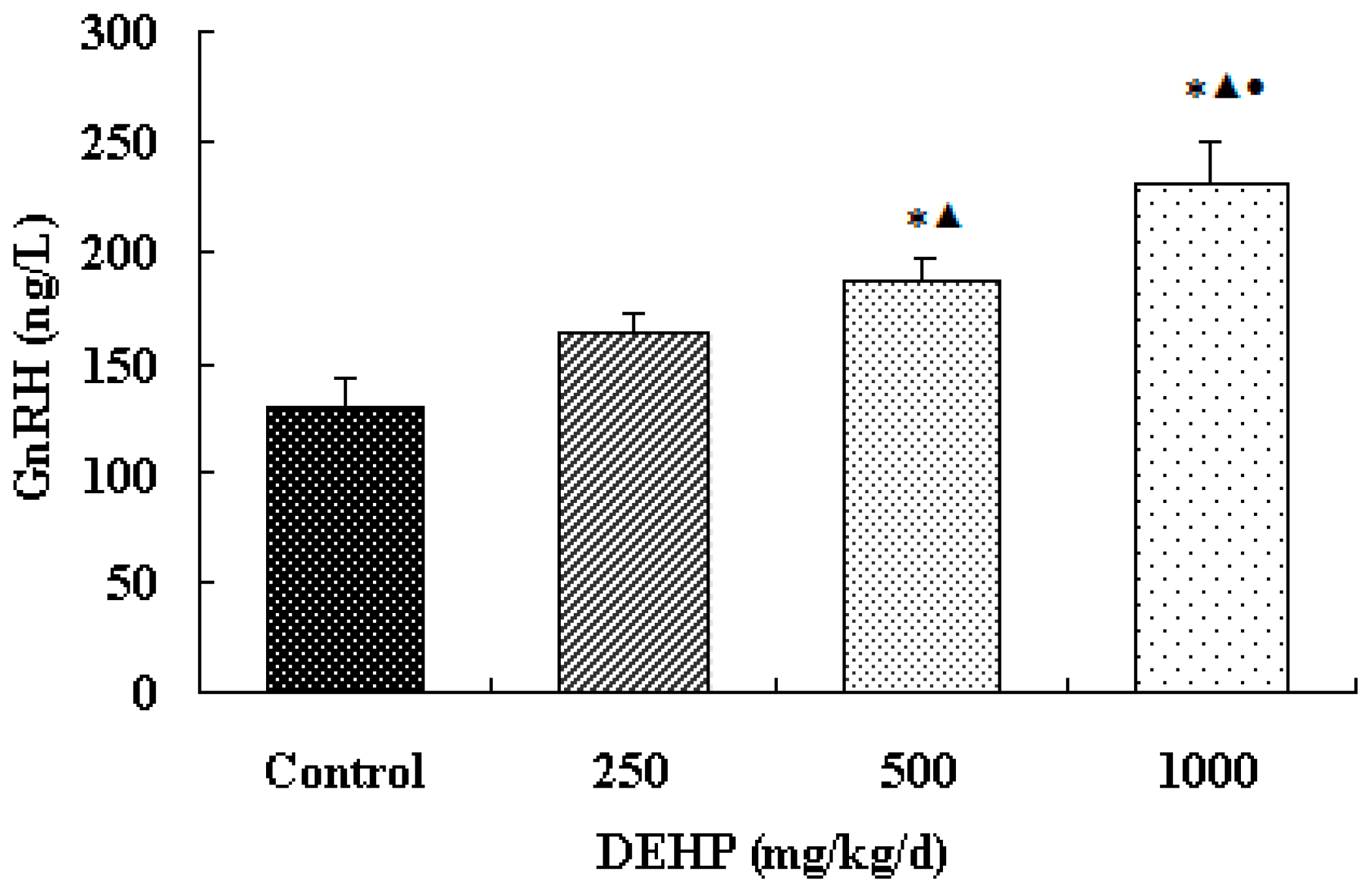 The result shows that the secretion of GnRH in the hypothalamus of the exposure group significantly increased. It indicates that the effect of DEHP is similar to that of GnRH agonists and estrogen. Sustained DEHP exposure might increase the sensitivity of GnRH in the hypothalamus and then raise the secretion of GnRH.