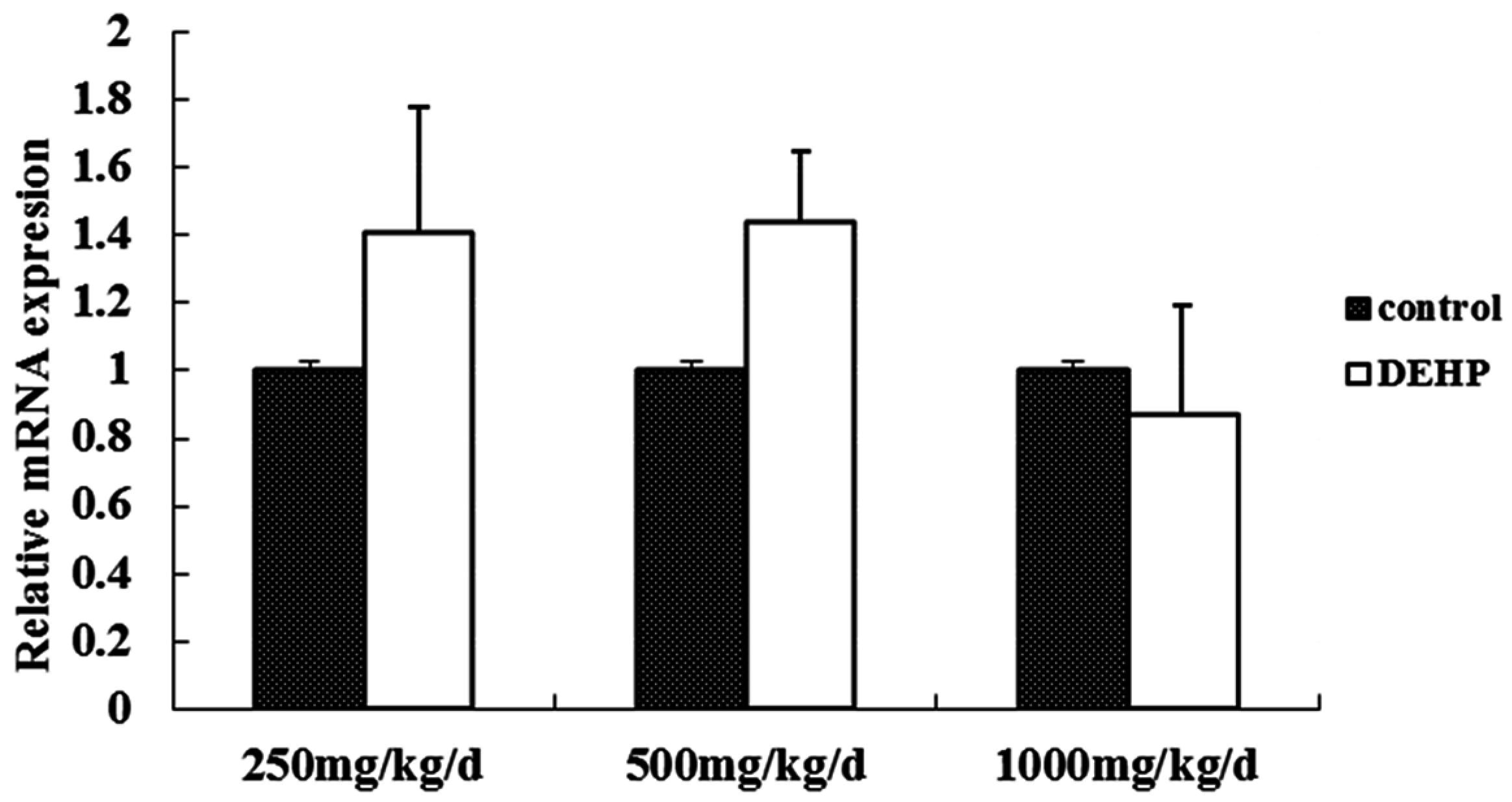 The mRNA level of GnRHR in the uterus was measured by real-time RT-PCR (Figure 6). The level in the uterus was significantly higher in the rats treated with 1000 mg·kg−1·d−1 DEHP compared with the rats in all other groups (p < 0.05).