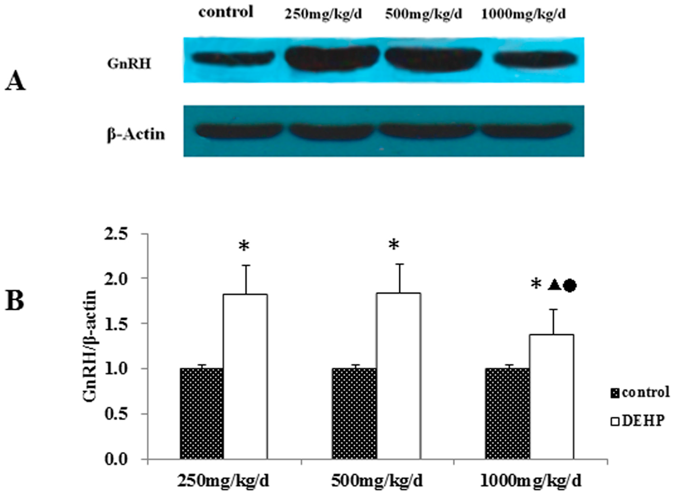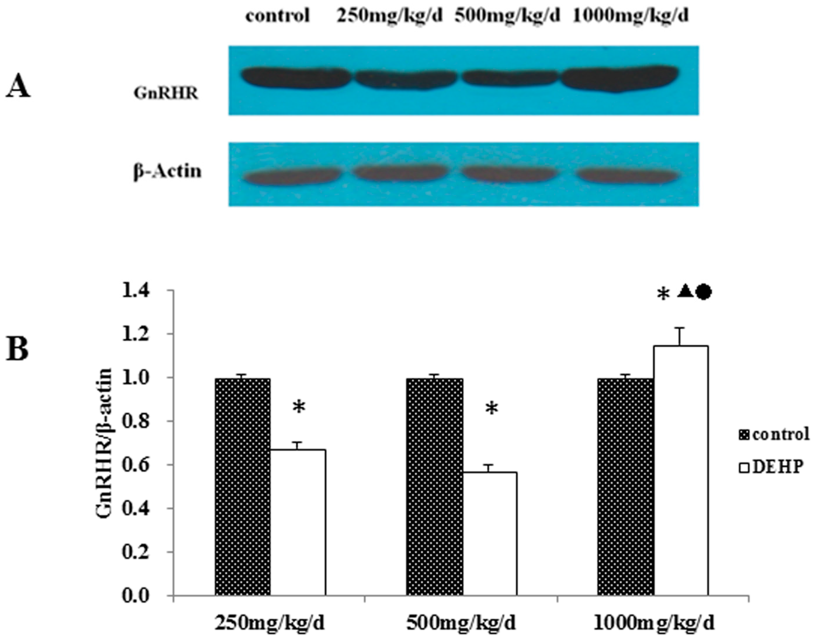 (A) Protein bands of GnRH expression in the hypothalamus of pubertal female rats. (B) effects of DEHP exposure on the protein level of GnRHR in the hypothalamus; n = 12. The level of GnRHR protein was expressed as the mean value ± standard error (SE). * Significant difference compared to control (p < 0.05); ▲ Significant difference compared to 250 mg/kg/d (p < 0.05); ● Significant difference compared to 500 mg/kg/d (p < 0.05).