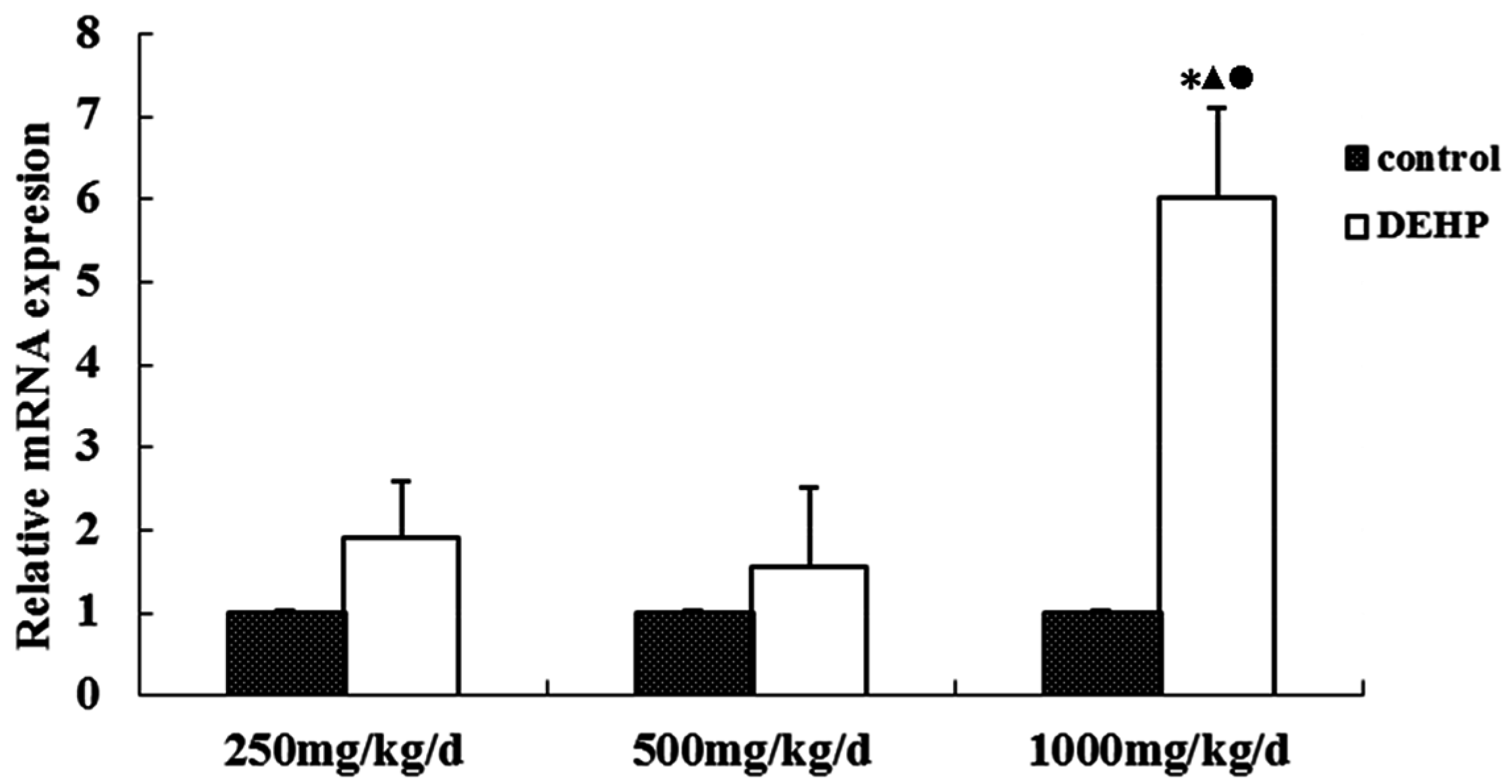 Effects of DEHP exposure on the level of GnRHR mRNA in the uterus; n = 12. The level of GnRHR mRNA was expressed as the mean value ± standard error (SE). * Significant difference compared to control (p < 0.05); ▲ Significant difference compared to 250 mg/kg/d (p < 0.05); ● Significant difference compared to 500 mg/kg/d (p < 0.05).