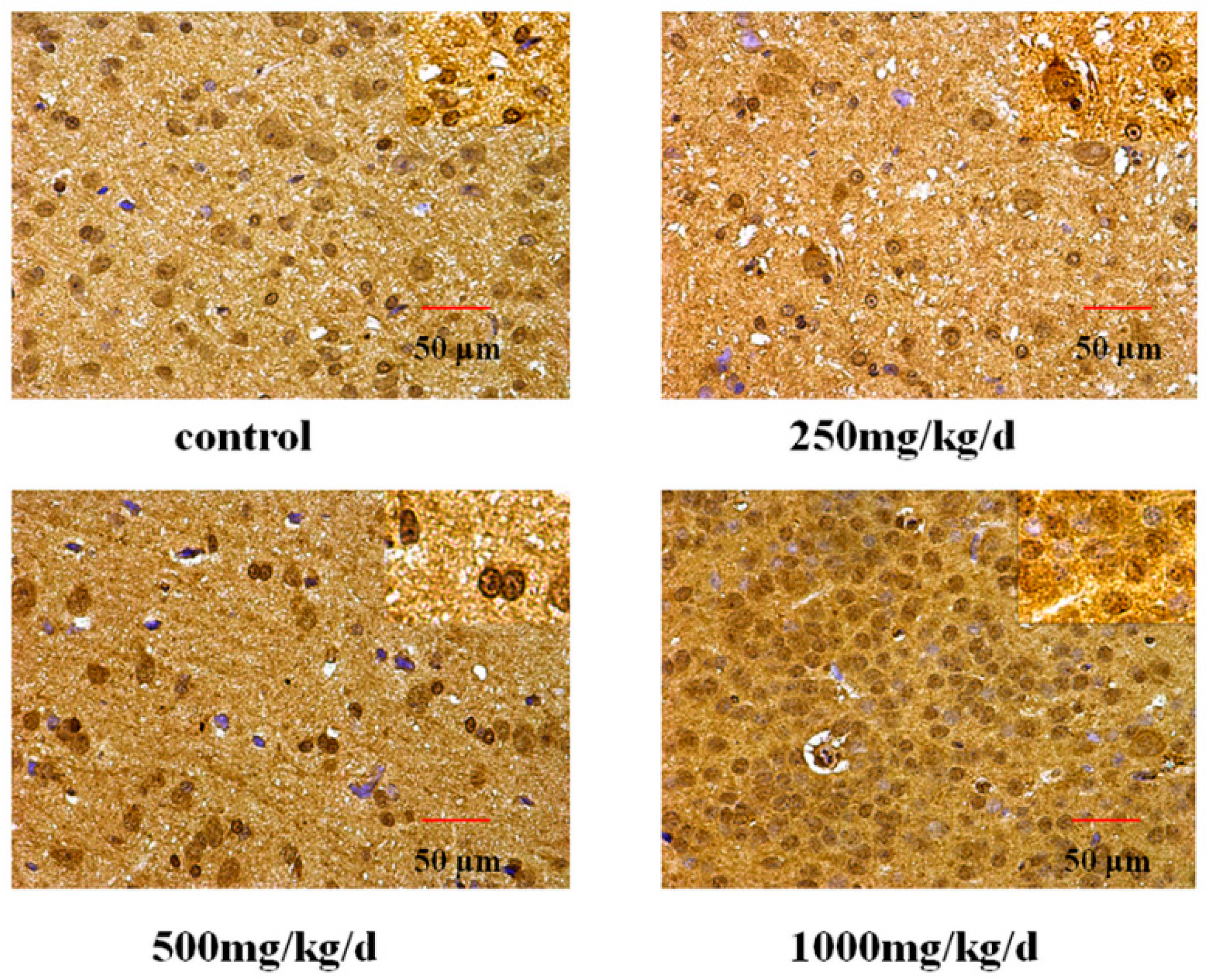The expression of GnRH in the hypothalamus of pubertal female rats was examined by immunohistochemistry (Figure 8, Table 5). Our results showed that positive staining for GnRH was observed in the cytomembrane, cytoplasm and nucleus of glial cells and neurons, and we could see the brown yellow granules. Compared with the control rats, the level of immunohistochemical staining in the hypothalamus was significantly higher in rats treated with DEHP.