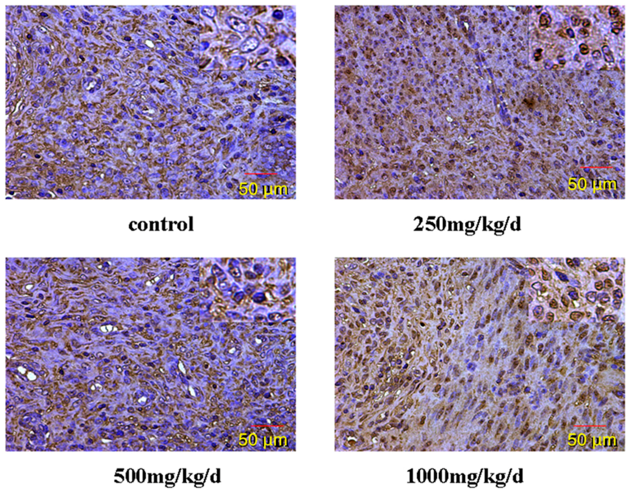 The protein level of GnRHR in the uterus was measured by Western blotting (Figure 7). The level of GnRHR in the uterus was significantly higher in the rats treated with 1000 mg/kg/d DEHP compared with the rats in all of other groups (p < 0.05). Compared with the control rats, the protein level was significantly lower in rats treated with 250 and 500 mg/kg/d DEHP (p < 0.05).