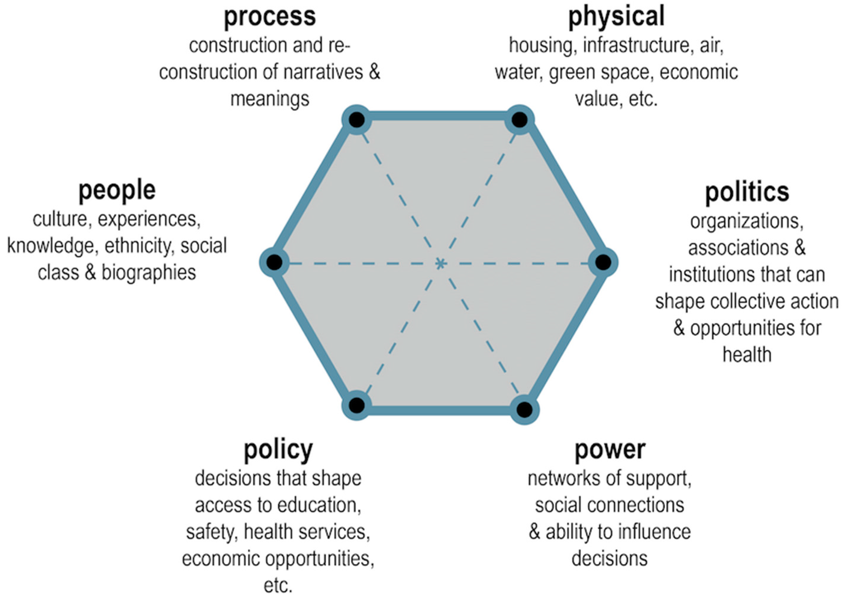 Urban places can be conceptualized as doubly constructed; through material and physical aspects (the buildings, streets, parks, etc., of the “built environment”) and through the assigning of meanings, interpretations, narratives, perceptions, feelings and imaginations to these places. This is a central feature of the dynamic processes that help define a relational view of place and health [10]. A relational view of urban places suggests that the meanings and ways people interact with their environments are contingent and contested, implying that there is no one single set of place characteristics, meanings or relationships that define a “healthy or unhealthy urban place”. This dynamic also demands that urban health research and practice explore the context-specific differences in social processes, such as power, cultural expression, and collective action, that are often revealed through the construction and reconstruction of environmental assets and hazards, material forms and social meanings in cities and urban areas [12].