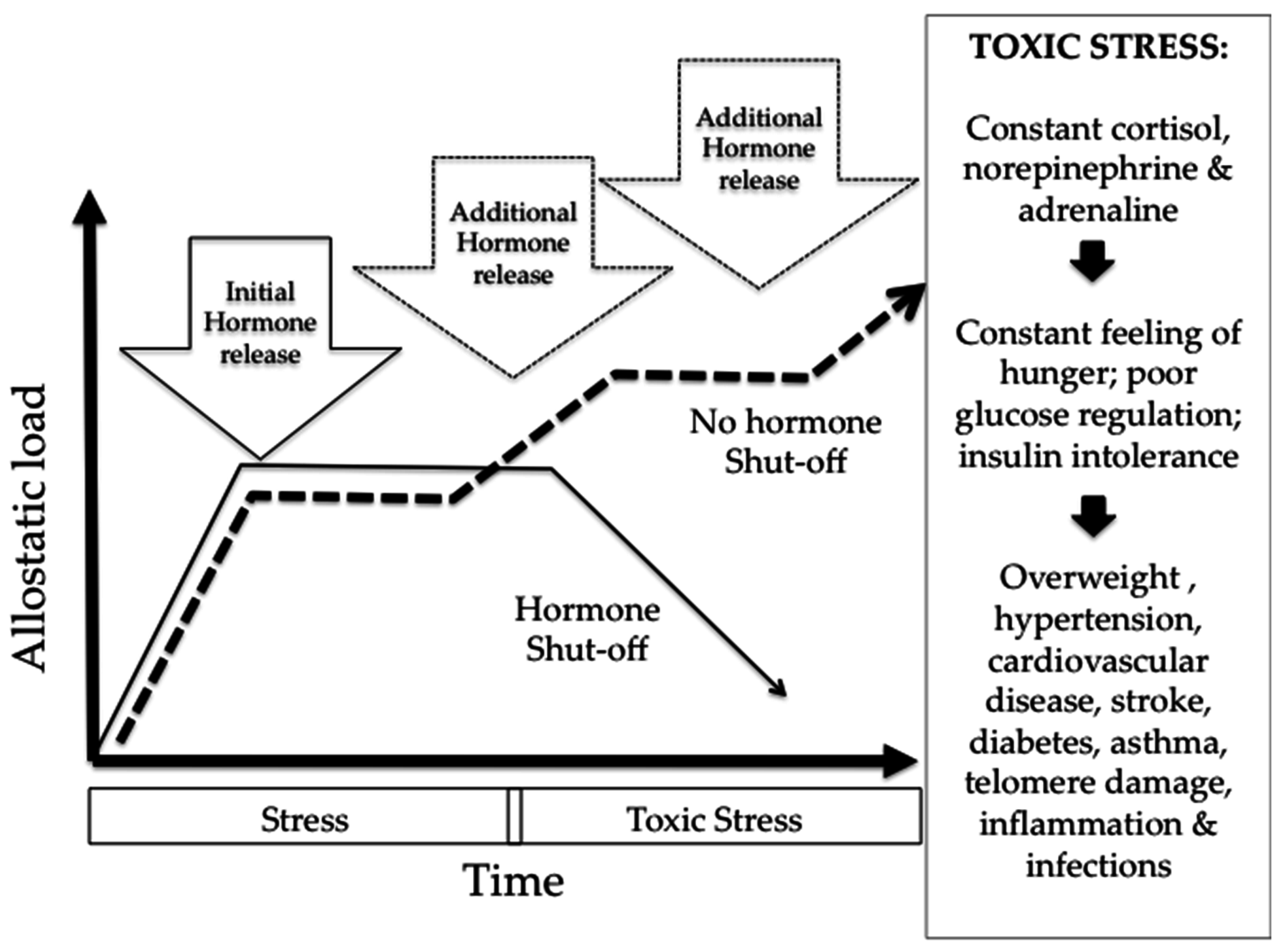 As we show in Figure 2, under “normal” stressful situations, the human body has a range of physical and chemical responses, but primarily epinephrine (adrenaline) and cortisol are released to bring the endocrine and immune systems back to homeostasis (Figure 2, solid line). The body’s ability to maintain stability under stress has been called allostasis [21]. In toxic stress situations, stressors are constant and the “allostatic load” continues to increase and the chemical release of “fight or flight” hormones does not properly regulate or shut-off (Figure 2, dashed line). Increased allostatic load wears away at the immune system as it overworks to manage the hormonal releases and attempts to return to homeostasis.