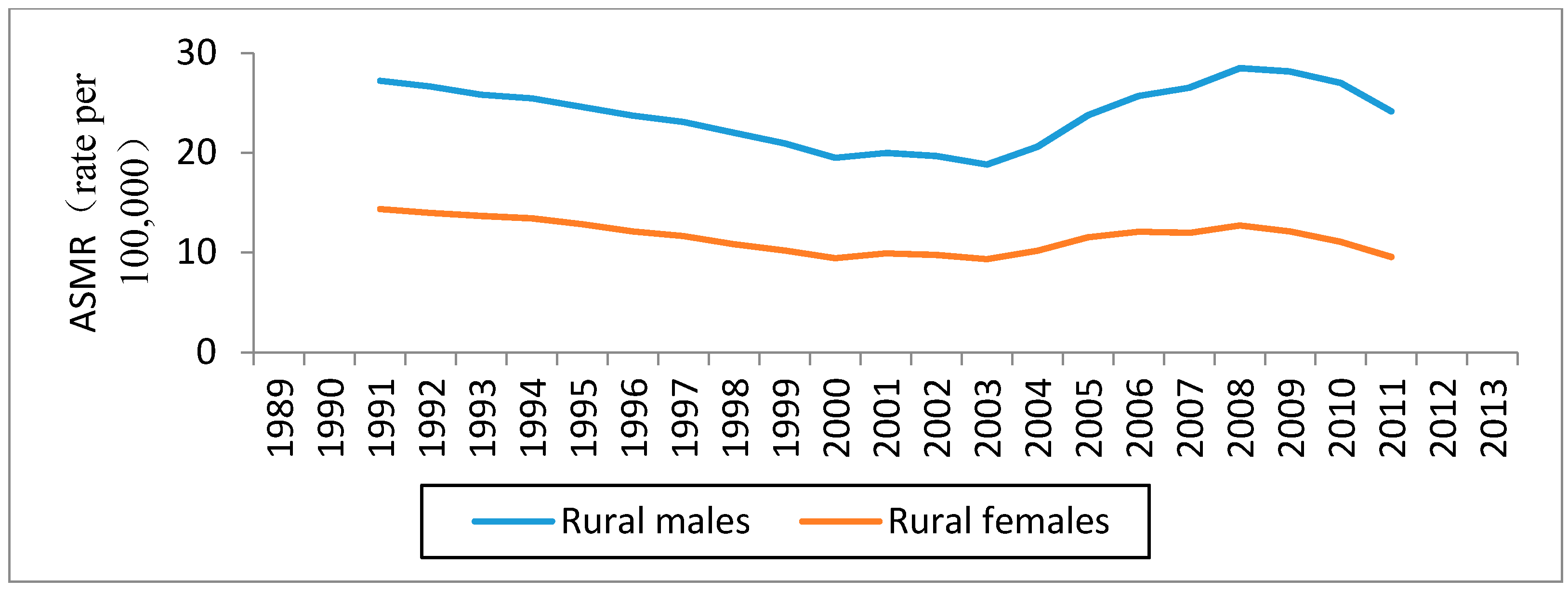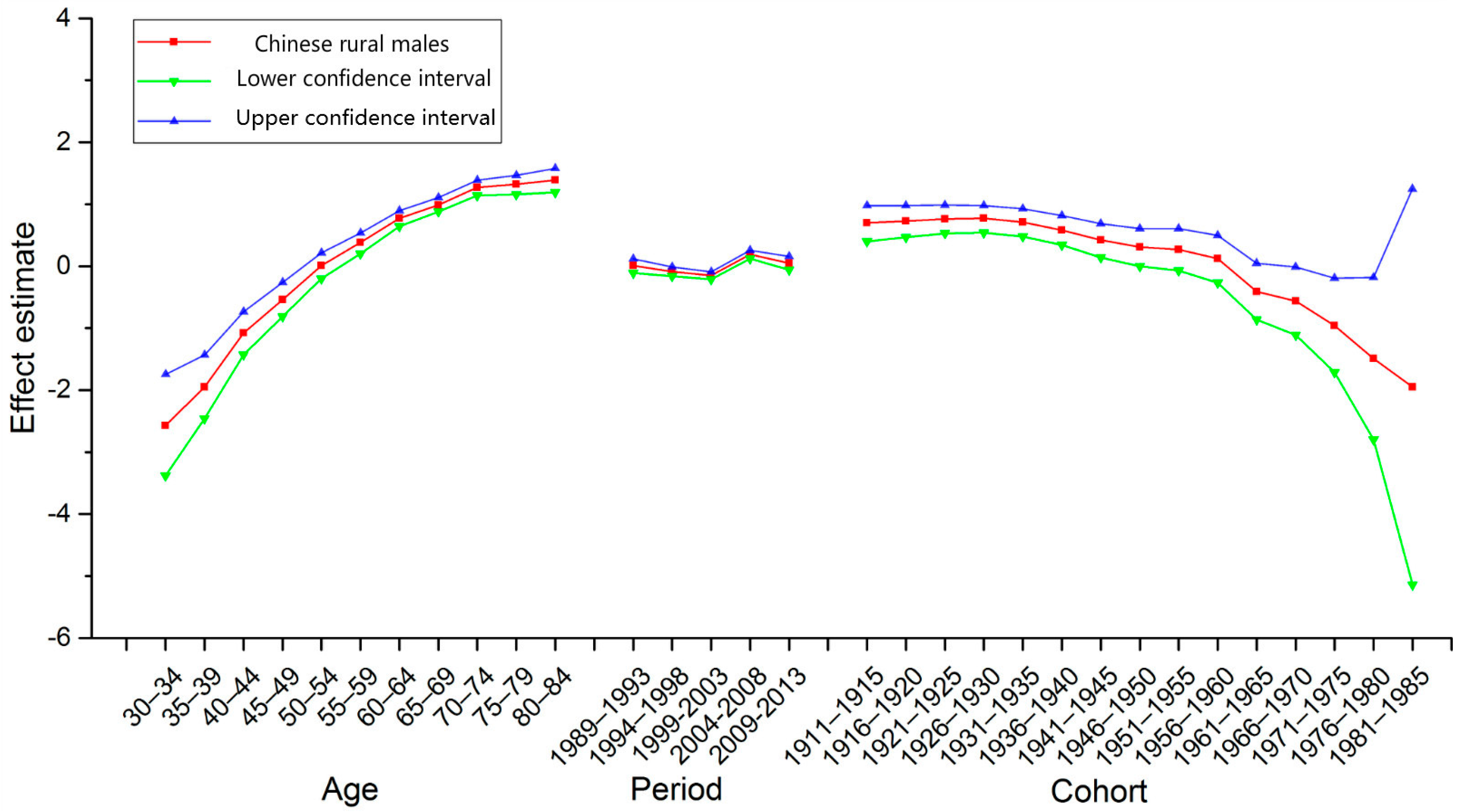 Period Effect. The period effect in rural China decreased from 1989 to 2003, and thereafter generally increased until the year 2008 in both sexes. After 2008, the period effect decreased again.