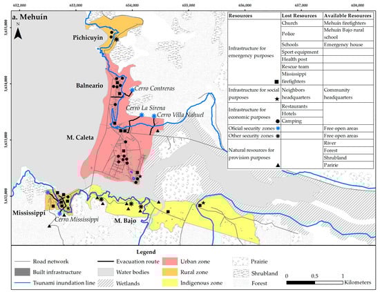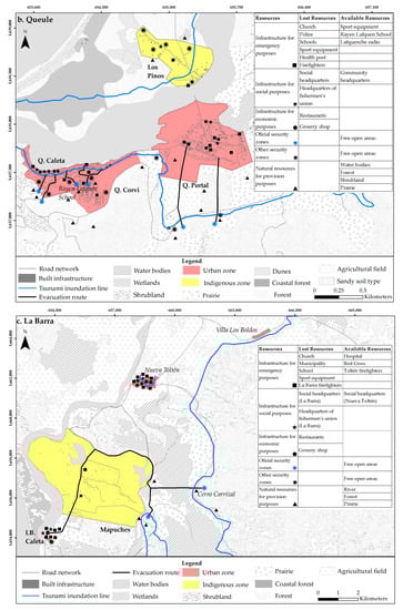 (a) Study town of Mehuín; (b) Study town of Queule; (c) Study town of La Barra; (d) Study town of Puerto Saavedra. Note: These maps show the urban, rural and indigenous areas of each study town, and indicate official security zones and evacuation routes. In addition, the available and lost resources after tsunami are mapped considering their location below and above the tsunami inundation line [26]. Sources: Civil Protection Plan in case of Tsunami 2013, Land Use Plans of Saavedra 2013 and Toltén 2012, and fieldwork on site.