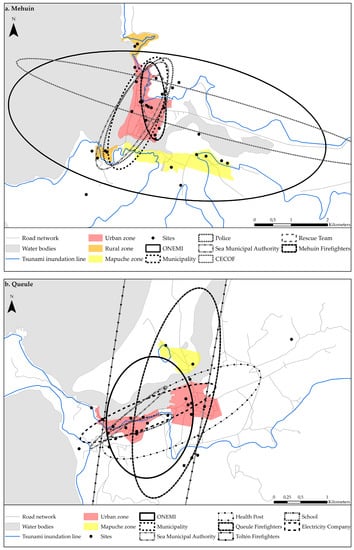 The results for Queule were similar to those found for Mehuín. The ellipses mainly cover the urban center and to a lesser degree covered the rural and indigenous sectors (Figure 5b, Table 2). The Municipality ellipse was the largest with an area of 217.28 km2. This ellipse lied in a north-south direction and had a rotation angle of 9.79. In contrast, the Sea Municipal Authority ellipse was the smallest. It had an area of 0.23 km2 and lied in east-west direction with an angle of 51.12. The sector that was covered by the largest number of ellipses (seven out of eight) was Q. Corvi, a touristic center located 30 m.a.s.l. with housing and educational infrastructure. In Q. Corvi, the ONEMI, School, Queule Firefighters, Toltén Firefighters, Electricity Company (SAESA), Health, and Municipality institutions interact (seven out of eight). Furthermore, the Rayen Lafquen School is located in this sector and serves as the official emergency shelter. Contrary to that found in Q. Corvi, the indigenous Los Pinos sector was only covered by the Toltén Firefighters, Queule Firefighters, and the Municipality ellipses (three out of eight).