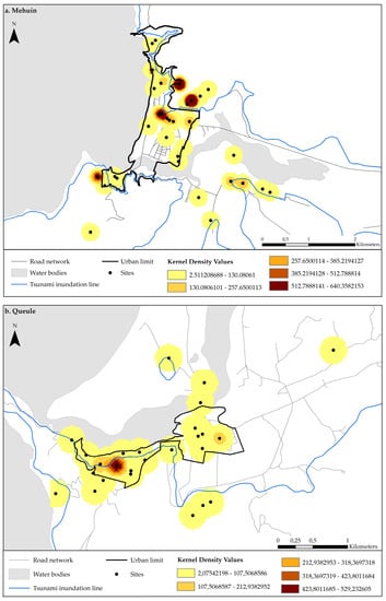 The frequency of mention of sites was recorded for each use associated to each place mentioned by the participants. Accordingly, four frequency matrices were obtained for each town. These were then subjected to the Kernel Density Index. The Kernel Density Index was used to identify the concentration of site uses and the most used sites in the towns. This was used, hence, to shed light on the multifunctionality, or diversity, of the sites. Kernel Density refers to how a phenomenon is spread across a landscape based on the quantity of a variable, for example evacuation, which is measured at each point. This analysis is based on the quadratic kernel function and can be used to explore spatial variation in event intensity [29,30]. Specifically, this index was used to calculate the uses associated with sites and their surrounding area. Thus, the analysis showed the density of 1 km2 sites mentioned by institutions; these were represented by five ranges for the four towns. The pixel size used was 25 × 25 m, including a spherical surface and a radius of 200 to 500 m. The results are illustrated in maps, which indicate the urban nodes with more intensity of use. The Kernel Density values are differentiated according to the shade and intensity of a particular color. Accordingly, the resulting kernel raster values are greater when the color is more intense, indicating that more points are located in the area. Overall, higher raster values reflect more diversity in governance, suggesting that more institutions are using the space for emergency purposes.