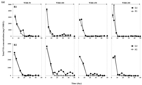 The highest effluent concentration of total VFAs was observed at a WRR of 100 mL/d in both R1 and R2, suggesting that this WRR may be optimal for efficient acidogenesis of Ulva biomass. As the composition of acidogenic intermediates significantly affects methanogenic performance, characteristics of the leachate are important factors for LBR operation [11]. The observation of acetate, propionate, and butyrate as the main acidogenic products (Figure 3b) agrees with previous LBR studies [8,11]. Acetate and butyrate are favorable intermediates for methanogenesis, and therefore, their dominance was likely beneficial for the efficient and stable biomethanation of Ulva biomass. Propionate is also a common acidogenic product in AD, but its accumulation is inhibitory to methanogenesis because its anaerobic degradation is thermodynamically unfavorable [26]. Although a temporary accumulation of propionate was observed in the early period at all WRRs, it degraded rapidly without apparent inhibition in both experimental systems.
