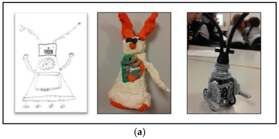 Finally, the dynamics observed during the process of building modelling clay and construction-block robots, a dynamics of constantly making/re-making/un-making the robot, calls into question the notion of HRI as a relation between one human and one robot. If, with the imaginary of an assemblage of relations, the notion of “the human” gets problematized, with the emergence of a network, the imaginary of several robots problematizes “the robot”. As stated by Corsín Jiménez [67], one of the main characteristics of prototypes is their capacity to call upon themselves, to re-functionalize their own purpose, producing new formats and devices for collective thinking in an ongoing open-ended process. This feature of prototypes was vividly identified during the process of robot design by children. Although prototypes are typically subject to processes of constant change, the storage limitations of the school only facilitated such change. The whole dynamics of putting away and maintaining the prototypes made of modelling clay and robotics construction blocks is closely connected with caring for the things which were being produced during the experience. Bringing such care issues to the fore is a way of acknowledging the overlooked dimensions of caring in material ordering [54,68]. The particular conditions for taking care of the robots during the participatory process account for the very emergence of multiple robots. As was observed throughout the design stages, both potentially and actually, the children’s imaginary of the interaction is not with one robot, but with several robots. Or, more accurately, it is the imaginary of several robots in the making.
