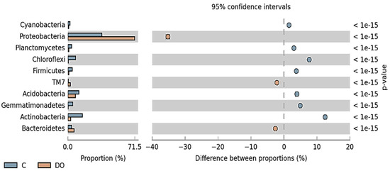 The relative abundance of dominant phylum of bacteria in the soil with the difference between proportions ≥1%. C—uncontaminated soil, DO—soil contaminated with diesel oil, P—soil contaminated with unleaded petroleum.