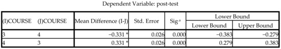 The comparison by course showed that after the intervention there were statistically significant differences in the level of knowledge of the fourth-year students compared to the third-year students (p = 0.000). By making a comparison by groups, the different interventions carried out were considered. The pairwise comparison showed that there were statistically significant differences (p = 0.000) between the two methodological interventions used with respect to the control group. However, no significance could be shown (p = 1.000) between film-forum and PBL. Both methodologies increased the level of knowledge, but there was no significant difference between them (Figure 4).