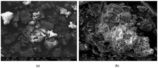 Scanning electron microscopy (SEM, Figure 1a–d) shows the surface structure of the most activated clay. The images consist of the fine particles of irregular shape and size on external surface with a micro-rough texture. The morphology of the clay in Figure 1a and b shows an irregular porous structure at lower magnifications. At higher magnifications, the clay soils images show a smooth irregular surfaces, and an expanded honeycomb, flared, “cornflake” and platy like texture (Figure 1c,d). The characteristic images show typical smectite clay surfaces which is consistent with the results obtained by [23].