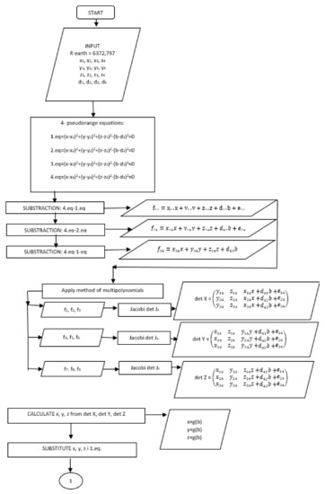 Solutions of the quadratic Equation (21) have two roots, b+ and b−. Therefore, we have to calculate the coordinates of the FO (x+, y+, z+) and P (x−, y−, z−). To come to the correct solution, we have to calculate the norm () for (x, y, z) b− and (x, y, z) b+. If the coordinates of the receiver are fed into the coordinate reference system, the norm of the position vector will be close to the value of the radius of the Earth (Rz = 6372.797 km) and this solution for the FO (x, y, z) will be regarded as a correct one [3,10,11]. The flowchart of the proposed algorithm is shown in Figure 1.