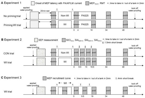 The experimental protocol. (A) Experiment 1 examined the priming effect of water immersion (WI) on paired associative stimulation with ISI of 25 ms (PAS25) by comparison between no priming and priming WI trials. After measuring onset of motor-evoked potential (MEP) latency induced by single pulse transcranial magnetic stimulation (TMS) with posterior-to-anterior (PA), anterior-to-posterior (AP), and lateral-to-medial (LM) current during a little contraction, MEPTEST and resting motor threshold (RMT) were measured at baseline, before PAS25 (between), and at 0 min, 15 min, and 30 min after PAS25 (post0, post15, and post30). (B) Experiment 2 examined the effects of WI on short-interval intracortical inhibition (SICI) and short-latency afferent inhibitions (SAIs) by comparison between non-WI (CON) and WI trials. After short latency evoked potential (SEP) measurement to determine stimulus paradigm of SAIs, SICI and SAIs were measured before (baseline) and after intervention (post0, post1, post2, post3, post4, and post5). (C) Experiment 3 investigated the changes in MEP recruitment curve before (baseline), during (during), and after WI (post0, post1, post2, post3, and post4).
