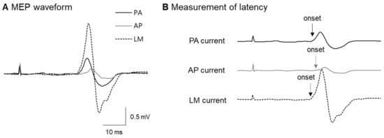 We measured the onset latency of MEPs using the PA, AP, and LM currents during mild contractions (<10% of the maximum voluntary contraction) of the target muscle (Figure 2), according to the method of Hamada, Murase, Hasan, Balaratnam, and Rothwell []. Previous studies found that PA currents preferentially activate early I-waves, whereas AP currents mainly activate later I-waves (e.g., I3) [,,]. Therefore, we decided to use the latency difference between the LM- and AP-evoked MEP onset as a measure of late I-wave recruitment (the longer the latency difference, the more efficient the later I-wave recruitment).