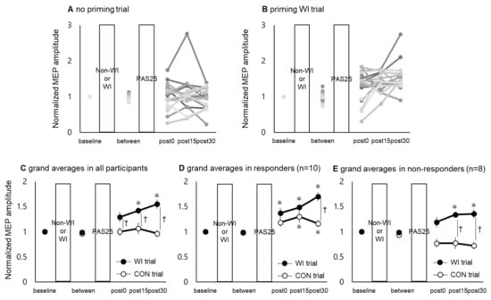 Time course of PAS25. (A,B) show individual responses to PAS25 in no priming and priming WI trials, respectively. Though there was high inter-individual variability for PAS25 response, (C) shows significant group difference of PAS25 response—increased in WI trial and unchanged in CON trial. (D,E) show PAS25 response in responders and non-responders. In responders, PAS25 response was facilitated in WI trial compared to CON trial. In non-responders, expected PAS25 responses were present in WI trial, whereas there were opposite responses or no response for PAS25 in CON trial. The x- and y-axes show measurement time points and MEP amplitude normalized to baseline, respectively. Asterisk (*) represents significant difference compared to baseline and “between” time points (p < 0.05). Dagger (†) shows significant difference between no priming and priming WI trials (p < 0.05).