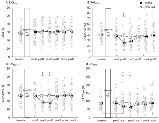 Two-way rmANOVA of the SAI25ms revealed a significant interaction between “trial” and “time” (F [6, 102] = 2.307, p < 0.05), as well as the main effect of “trial” (F [1, 17] = 6.200, p < 0.05), but no main effect of “time” (F [6, 102] = 1.714, p = 0.125). Moreover, post hoc comparisons revealed significant differences in the values at post1 and post2, compared to those at baseline only in the WI trials (p < 0.05, Bonferroni-corrected); however, there were no significant differences in the values in the CON trials. In addition, there were significant differences in the values between the CON and WI trials at post1 and post2 (p < 0.05, Bonferroni-corrected).