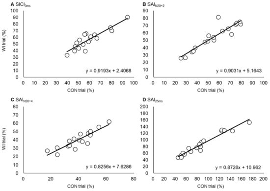Test–retest reliability of SICI3ms (A), SAIN20+2 (B), SAIN20+4 (C), and SAI25ms (D). Black lines show regression lines in each parameter. The x- and y-axes show each value in CON and WI trials. ICC values (detail in results) mean higher test–retest reliability in all parameters.
