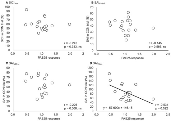The relationships between PAS25 response and SICI3ms (A), SAIN20+2 (B), SAIN20+4 (C), and SAI25ms (D). Black lines show regression lines in each parameter. The x- and y-axes show PAS25 response and each value in CON trials, respectively. As shown in (A–C), there was no correlation between PAS25 response and each value (SICI3ms, SAIN20+2, SAIN20+4). On the other hand, (D) shows a significant negative correlation between PAS25 response and SAI25ms, which indicates that SAI25ms would be a predictor for PAS25 response.