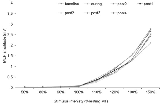 The MEP amplitudes were analyzed by two-way rmANOVA, with “intensity” (from 50% to 150% RMT) and “time” (baseline, during, post0, post1, post2, post3, and post4) as the within-subject factors.