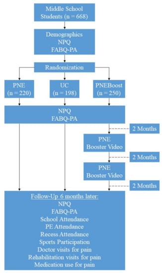 However, an important question remains unanswered. Will a program such as this yield any downstream positive behavioral results? In all mass-education, population-based studies, behavior change is the key to success []. For example, in smoking-cessation programs, the ultimate result is smoking cessation []. To truly determine if such a PNE program results in behavior change would need to be demonstrated. It is important to realize that education typically as a stand-alone intervention for behavior change is very limited. For example, the US spends $2.1 trillion annually on smoking-cessation programs and yields a 20–25% success rate [,,]. With the development and validation of the PNE middle school program complete, this study set out to examine if PNE delivered to middle-school students would yield positive behavior changes during/after the school year, as measured six-months later. In line with previous PNE studies, three educational approaches were established for testing: one-time, in-person PNE delivered session (PNE); one-time, in-person educational session using current school or ‘usual curriculum’ content on pain (UC) and PNE session followed by two booster sessions (PNEBoost). Three aims were formulated. Aim One was to determine if there would be any difference between the three groups, six months later in terms of school, physical education (PE), sports and recess attendance/participation as well as healthcare choices (doctors’ visits, rehabilitation visits and/or pain medication use). The second aim was to compare the three groups’ six-month outcomes taking into consideration demographic variables (gender, pain at the time of the intervention, having experienced pain >3 months, knowing someone with chronic pain, high level of fear-avoidance and pain knowledge). The third and final aim was to determine which demographic variables were most associated with school attendance, PE participation, recess participation, and sports participation in the ensuing six months.