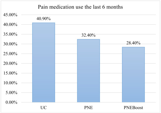 Tukey post hoc analysis revealed that PNEBoost had higher scores on the rNPQ at 6 months compared to the UC group (p = 0.017). There were no other statistically significant pairwise comparisons (p > 0.310). There were no differences in the proportions of participants among the 3 groups for those seeing a doctor for pain (p = 0.585) and attending rehabilitation for pain (p = 0.972); however, there was a significant difference among the 3 groups in the proportion of participants (PNE = 32.4%; PNEBoost = 28.4%; UC = 40.9%) who took medication for pain in the 6 month period following the intervention (p = 0.024). The absolute difference in proportions between the UC and the PNEboost groups was 12.5% (UC-PNEboost); however, the relative difference in the proportions was 30.6% (UC-PNEboost/UC) (Figure 2).