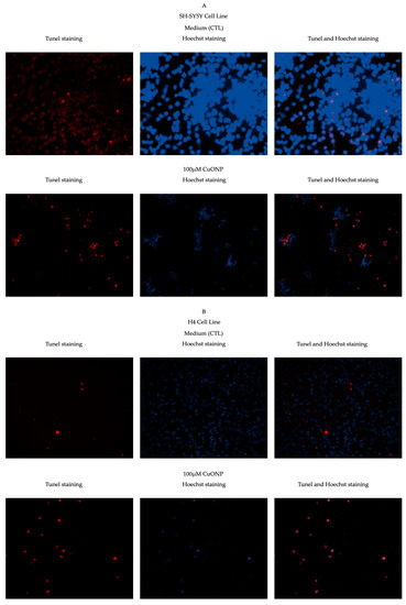 The TdT-mediated dUTP nick-end labeling (TUNEL) assay (TMR-RED in situ cell death detection kit) (Roche Applied Science, Penzberg, Germany) was carried out as per the manufacturer’s instructions. H4 cells: 2.0 × 104, SH-SY5Y cells: 4.0 × 104 and PC12 cells 4.0 × 104 were plated into an 8-well glass chamber slide System (Fisher Scientific, Hampton, NH, USA) and grown for 24 h. Then cells were treated with CuONP 100 μM or medium (CTL). All experiments were performed for 24 h. After treatment, cells were washed with cold PBS and fixed with 4% paraformaldehyde 1 h, then incubated with permeabilization solution for 5 min on ice; cells were incubated with enzyme mixture for one hour in the humidified atmosphere for 60 min at 37 °C in the dark. Then Hoechst (Invitrogen, Carlsbad, CA, USA) was used to stain total nuclear. The optical sections were taken with a fluorescent microscope and the number of TUNEL-positive cells were counted.
