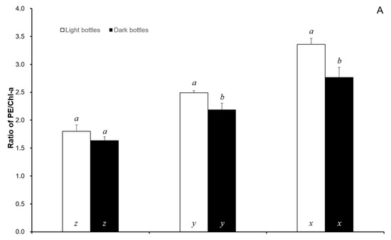 The ratios of PE/Chl-a (A), PC/Chl-a (B), and APC/Chl-a (C), in S.suiae, following 24 h exposure with control, 1, and 5 Cd2+ mg/L. Data in the same ambient cadmium level having different letters (a and b) are significantly different (p < 0.05) between light and dark bottles, and data in the same light or dark bottles having different letters (x, y and z) are significantly different (p < 0.05) among different ambient cadmium levels; Chl-a—chlorophyll a; PE—phycoerythrin; PC—phycocyanin; APC—allophycocyanin.